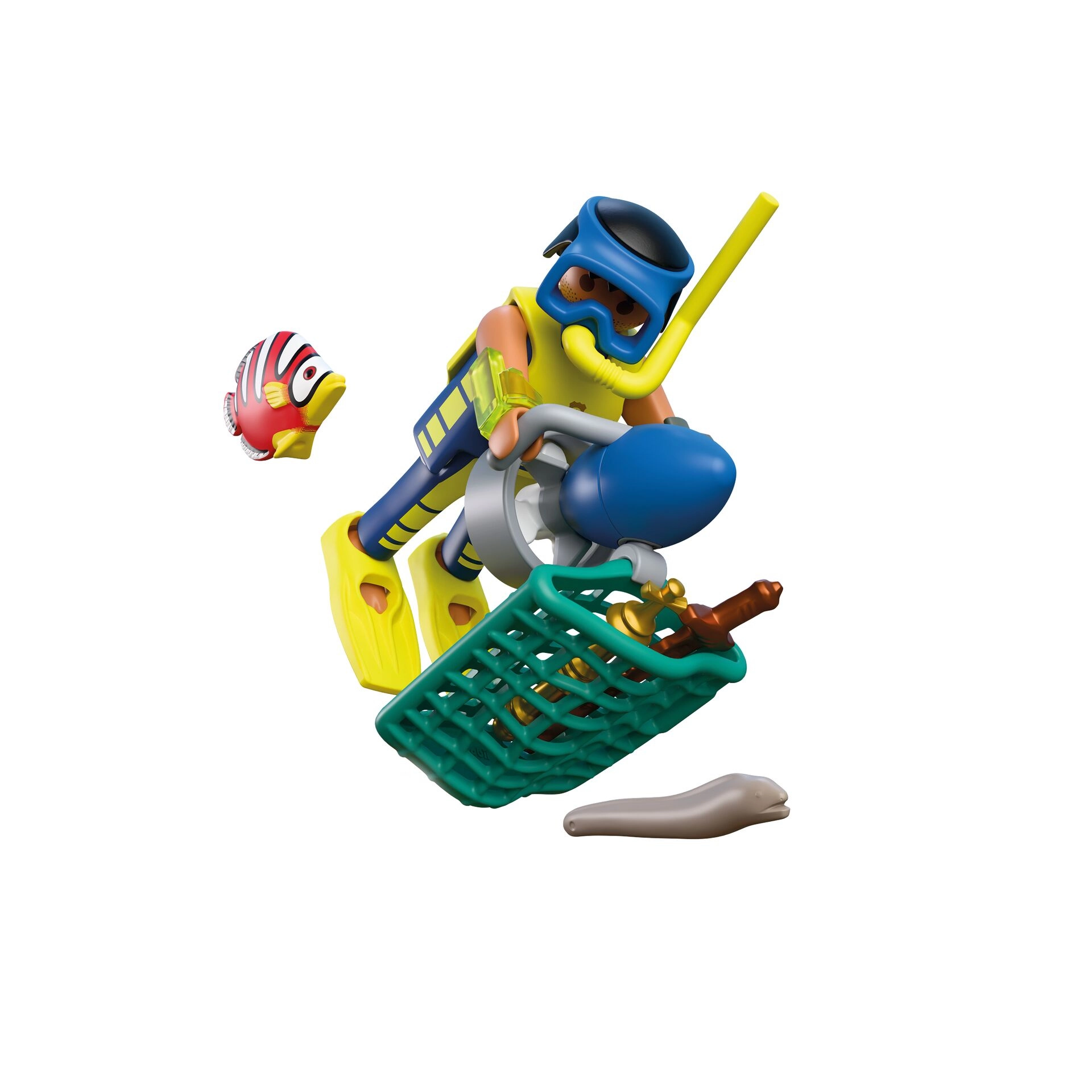 Maske, peraje, boca s kisikom i podvodni skuter potiču kreativnu igru; koš omogućuje prikupljanje nalaza i stvaranje novih misija.