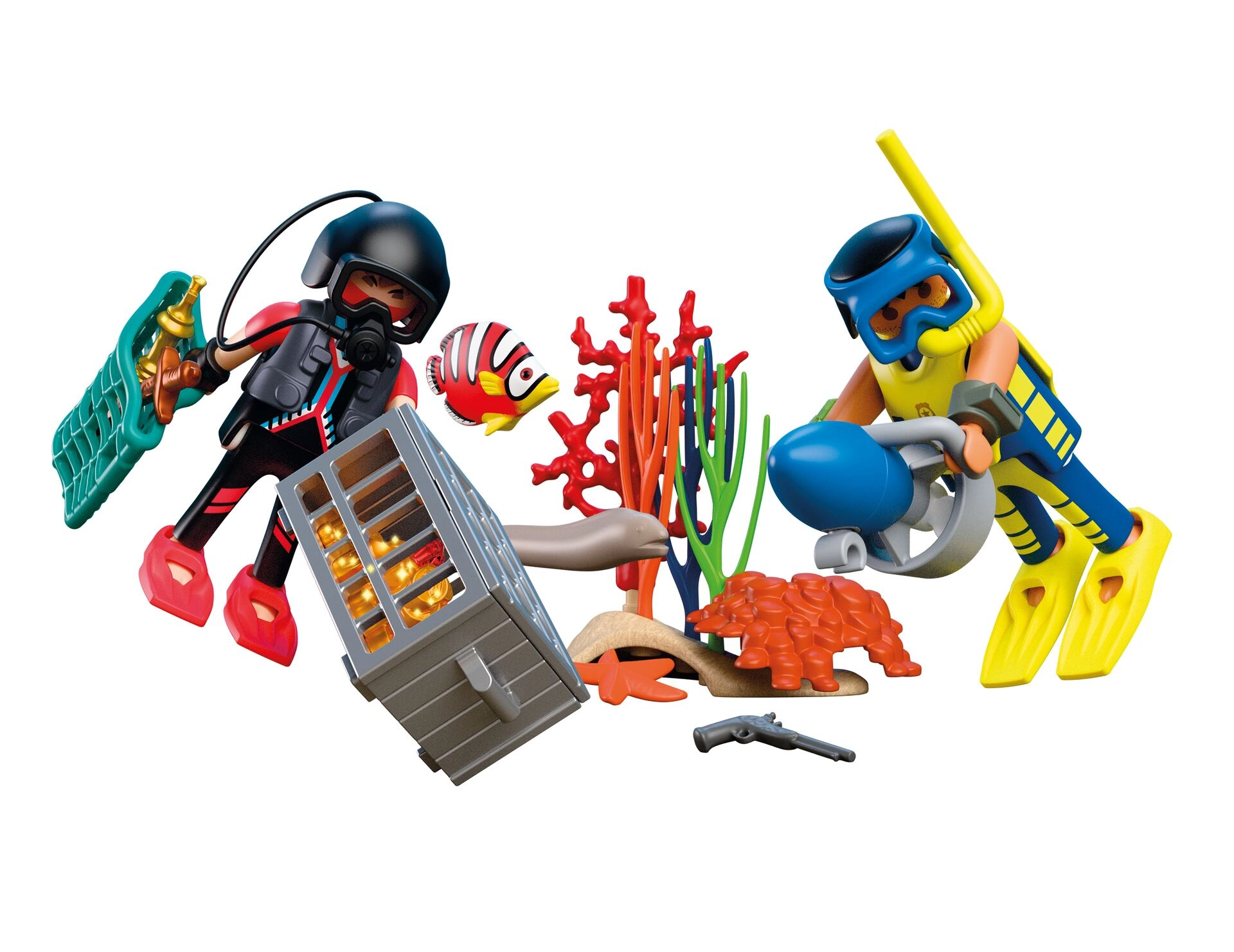 Set sadrži 2 figurice s pomičnim zglobovima, mrežastu košaru, škrinju, zlato, dragulje, oružje te bogate koralje i morske životinje za realistične scene.