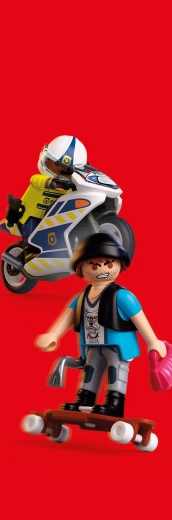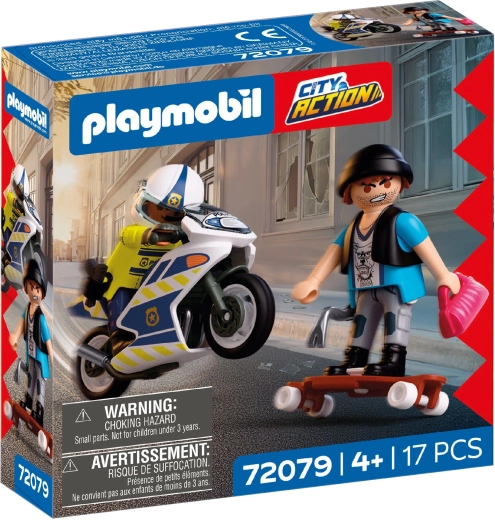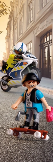 Pokrenite napetu akciju u gradu s igranim setom PLAYMOBIL City Action. Policajac na motociklu progoni lopova na skateboardu i pokušava vratiti ukradenu torbicu. Set sadrži 2 figurice, policijski motor, longboard/skateboard i mnogo autentičnih dodataka za realistično igranje uloga.