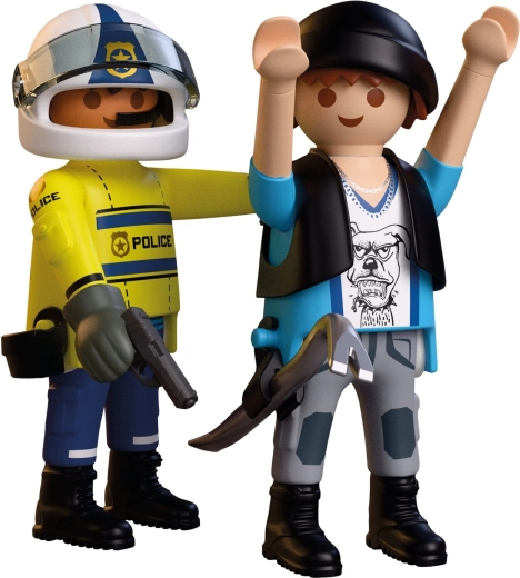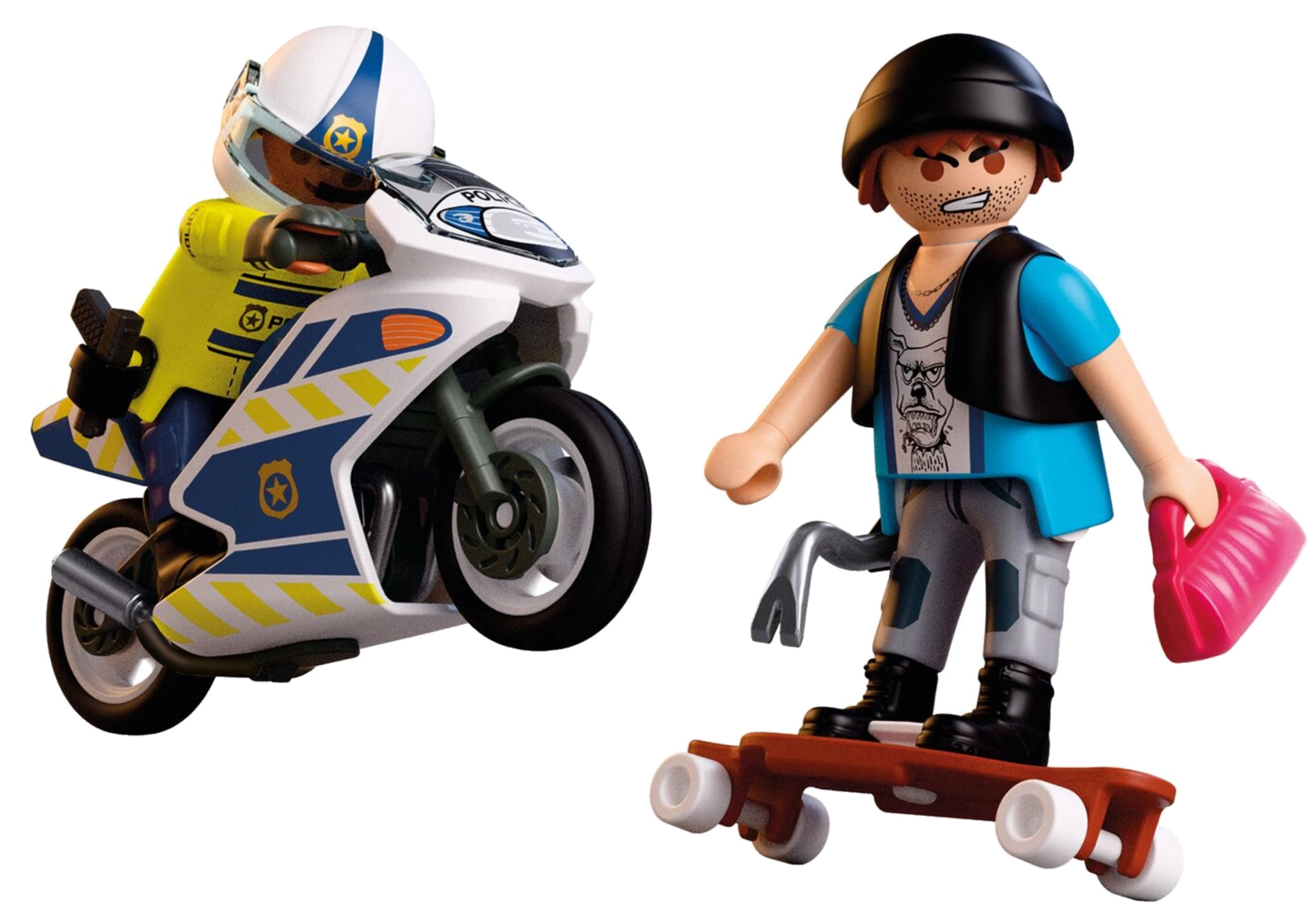 - Sadržaj seta: 2 figurice (policajac i lopov, cca 7,5 cm), policijski motocikl, skateboard/longboard, kaciga, rukavice, futrola, pištolj, kapa, torbica, držač i pajser.