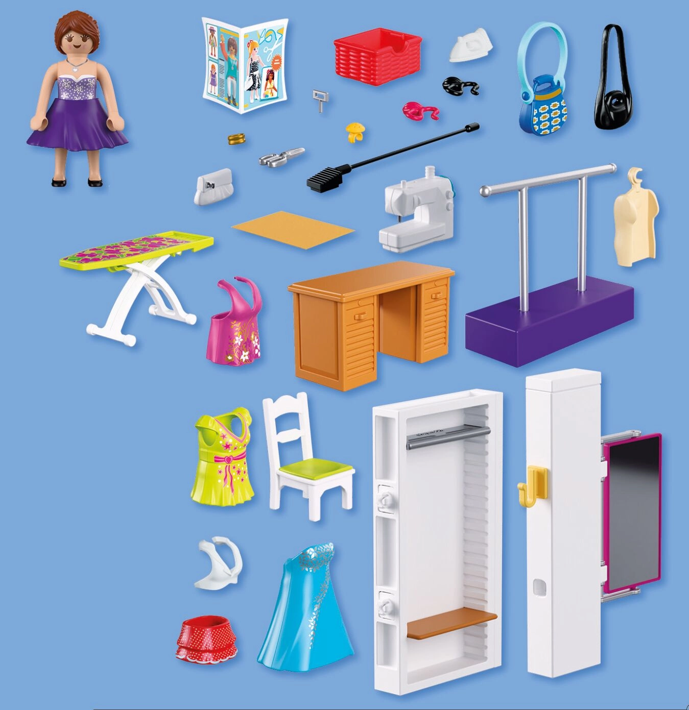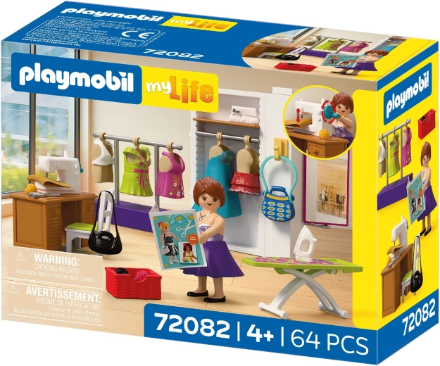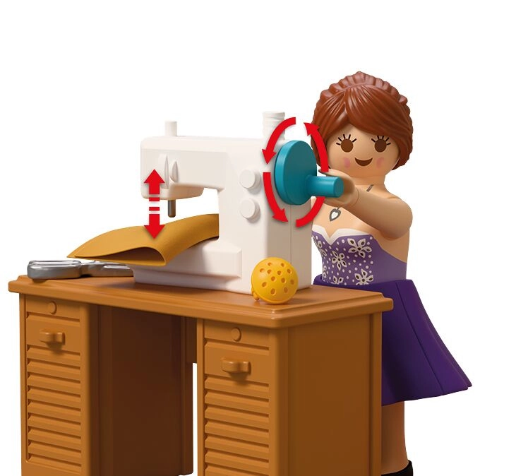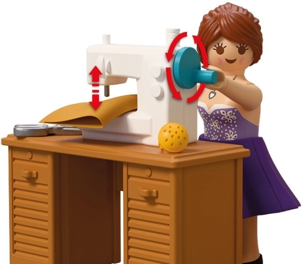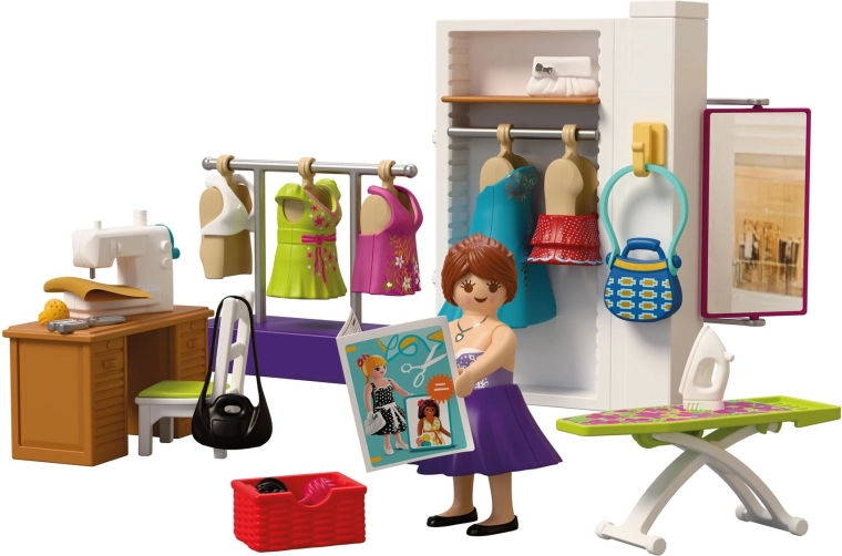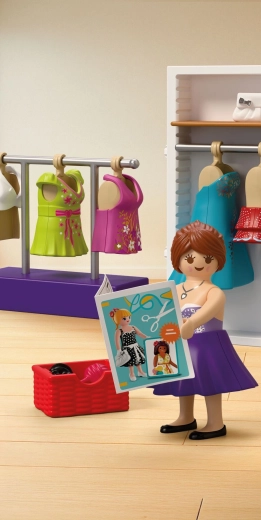 Sastavni dio je sve za kompletan modni atelje: stol, stolica, tkanine, škare, jastučić za igle, klupko vune, torbice i druge sitnice. Set se sastoji od 64 dijela i može se kombinirati s drugim PLAYMOBIL setovima za još bogatije priče.