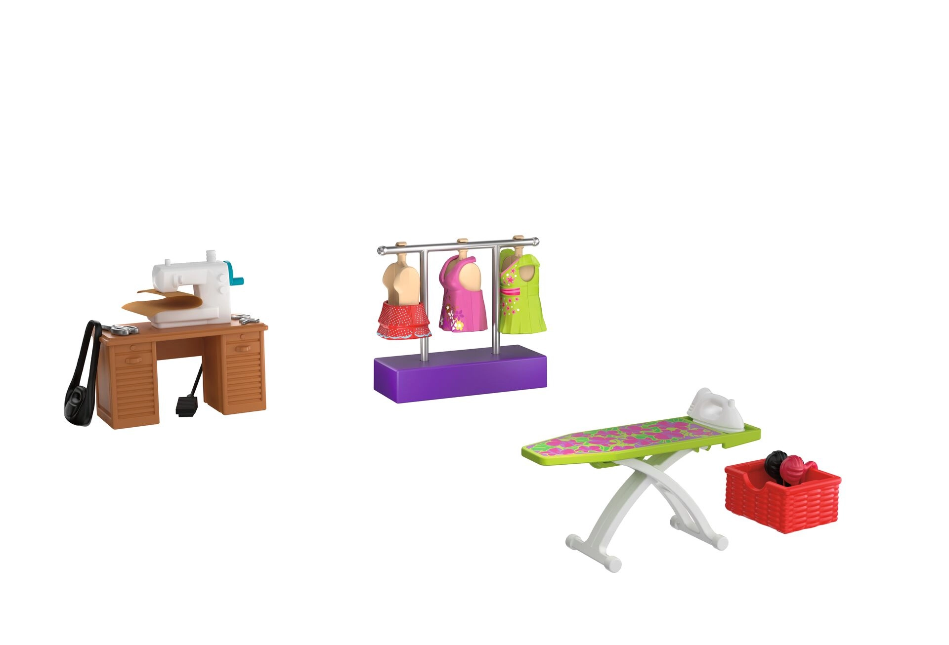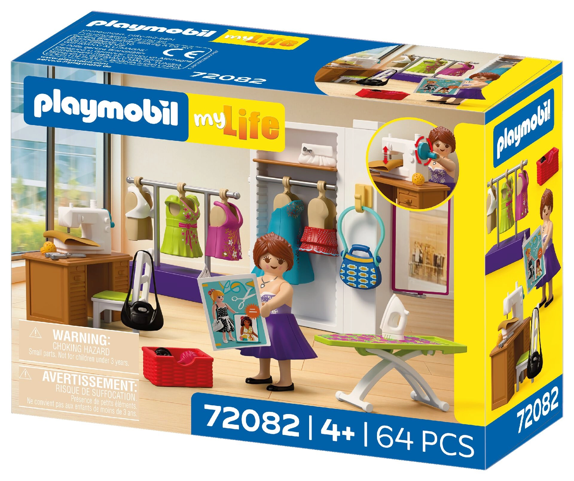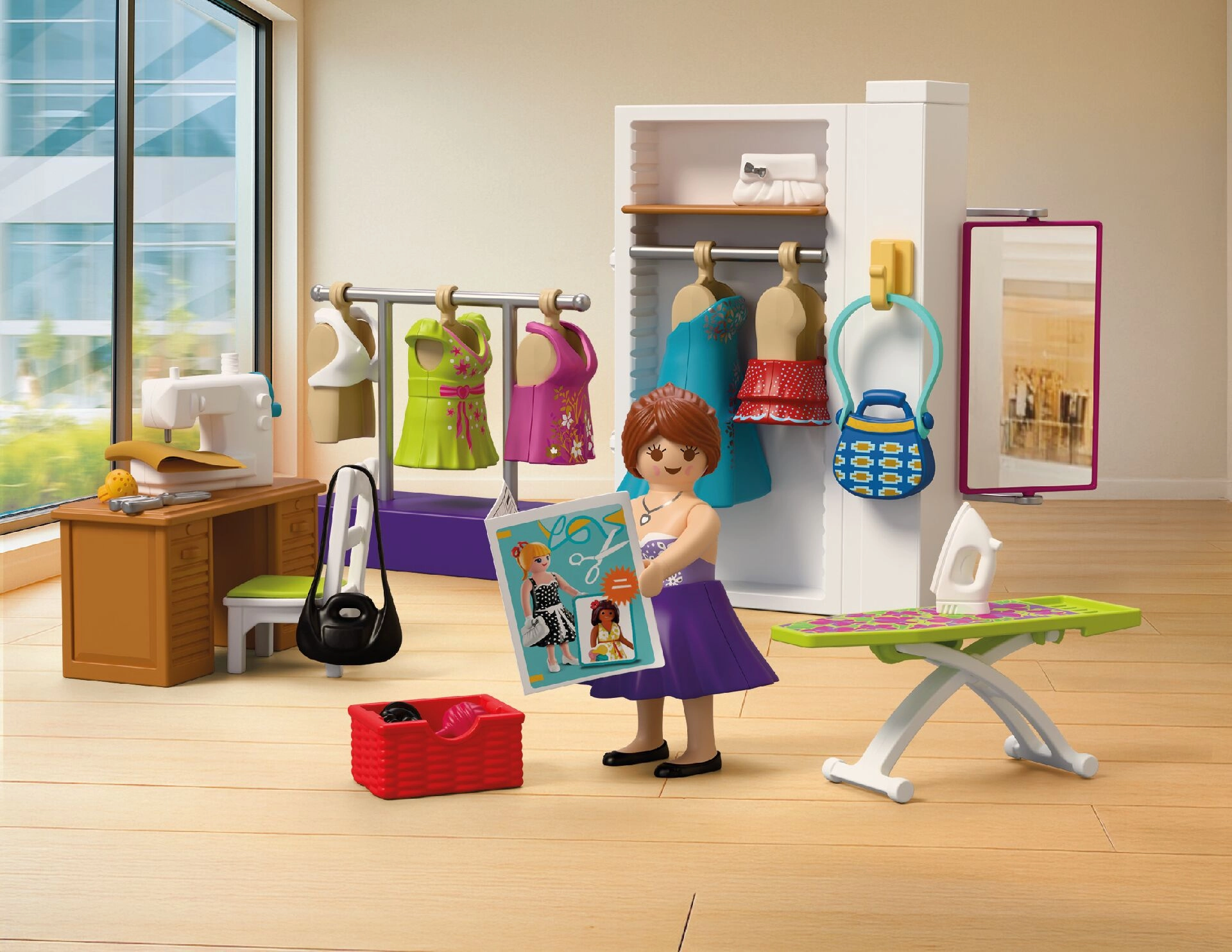 Sastavni dio je sve za kompletan modni atelje: stol, stolica, tkanine, škare, jastučić za igle, klupko vune, torbice i druge sitnice. Set se sastoji od 64 dijela i može se kombinirati s drugim PLAYMOBIL setovima za još bogatije priče.