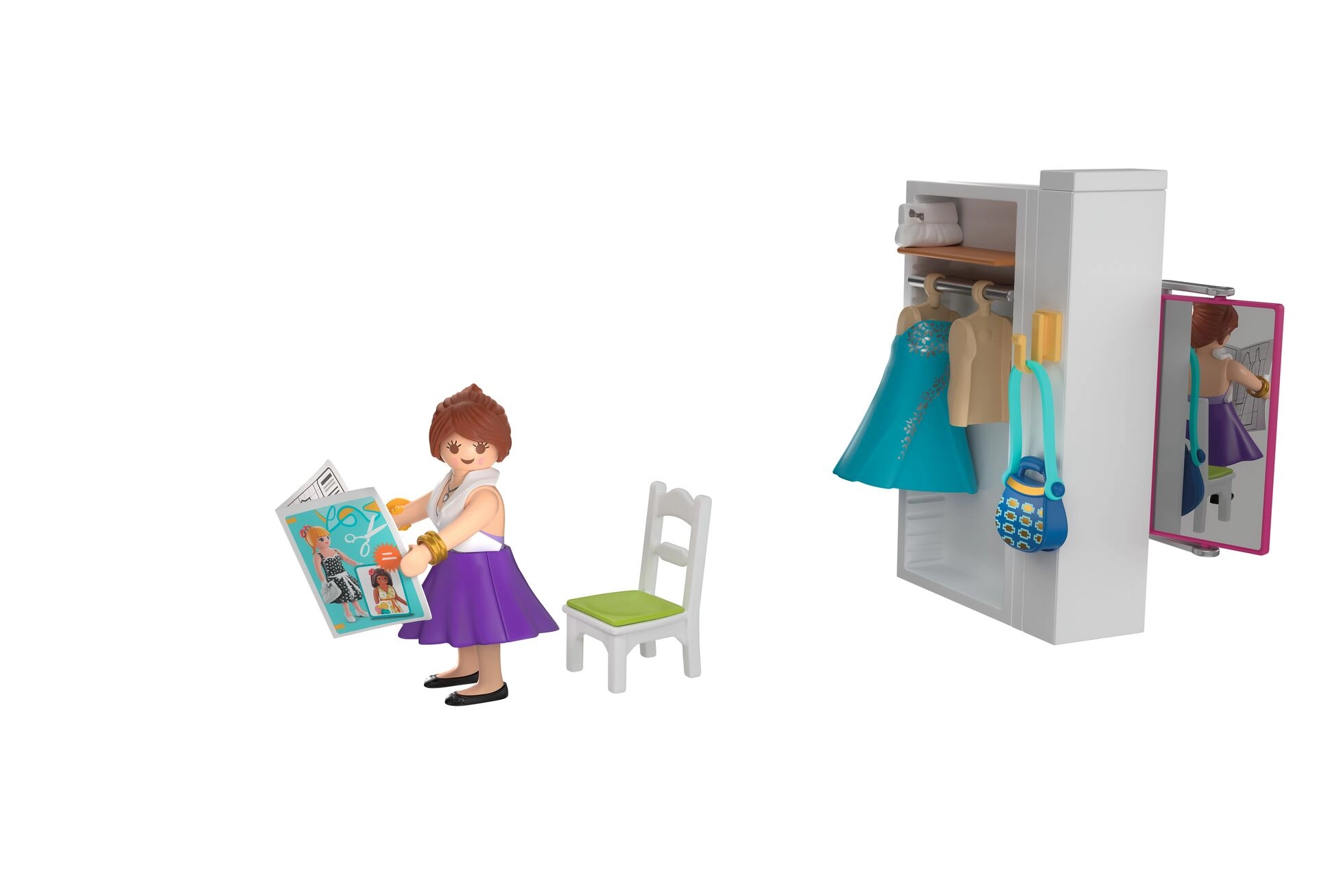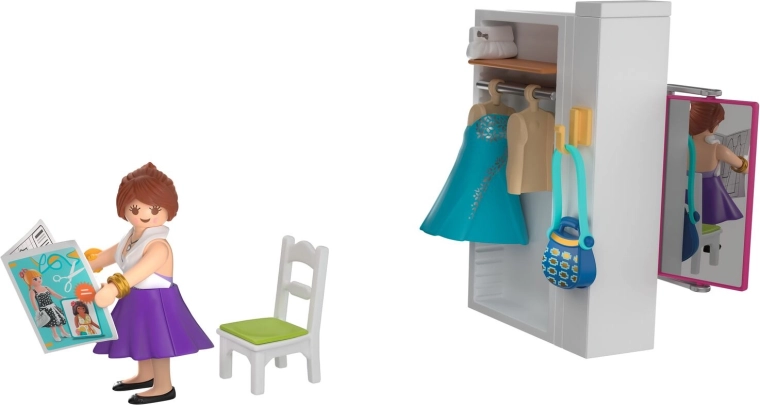 Uđite u kreativni svijet s igraćim setom PLAYMOBIL Moj život – modna dizajnerica. Djeca mogu osmišljavati i isprobavati haljine, suknje i topove, šivati na šivaćem stroju, glačati i usklađivati dodatke. Pokretno ogledalo, ormar, vješalice i bogata oprema potiču maštu i igru uloga.