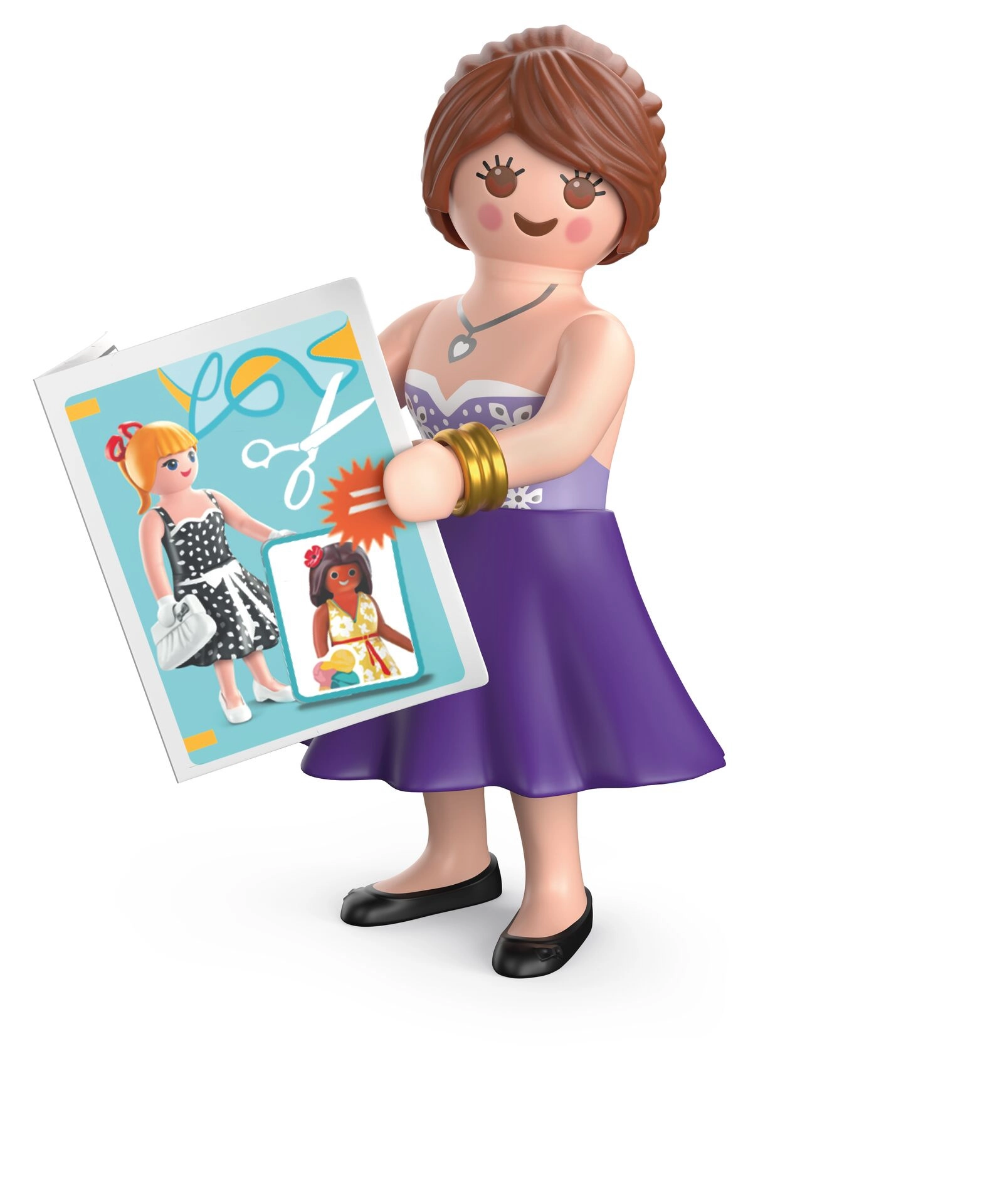 - Figura dizajnerice (cca 7,5 cm), 2 suknje, 3 haljine, top, ormar, pokretno ogledalo, daska za glačanje, glačalo, pismo-torbica, 2 torbe, šivaći stroj, stol, stolica, tkanina, škare, arak s krojevima, klupko vune, jastučić za igle, košarica i dodatna oprema