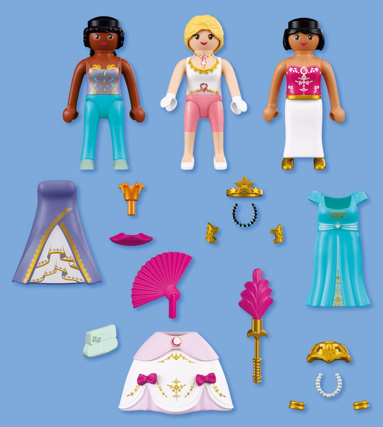 Tri očaravajuće princeze pozivaju djecu u svijet kraljevskih pustolovina. Zahvaljujući zamjenjivim haljinama, suknjama i nakitu mali kreativci mogu lako mijenjati izgled figurica i izmišljati sve nove priče – od veličanstvenog bala do šetnji dvorskim vrtovima.