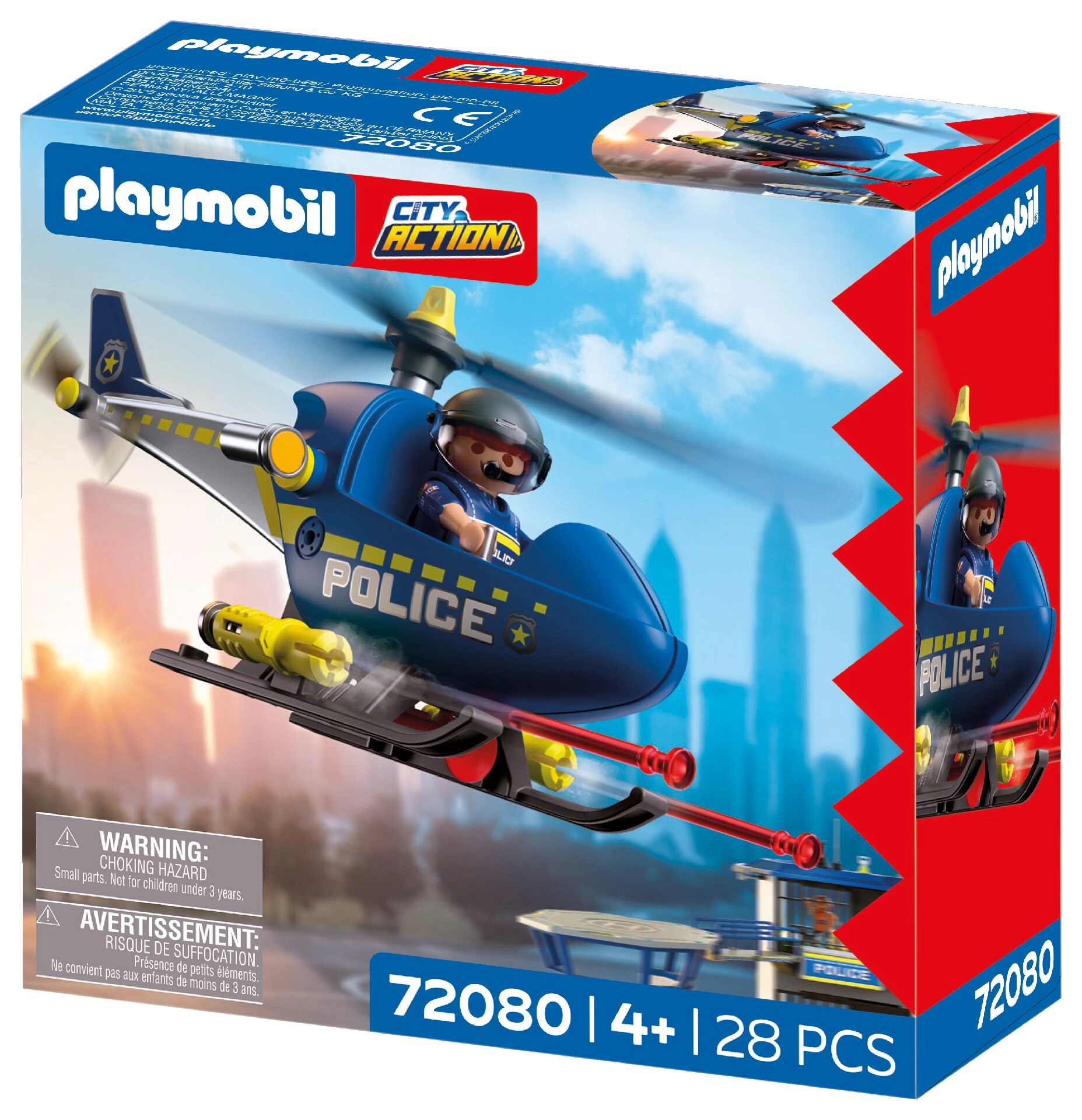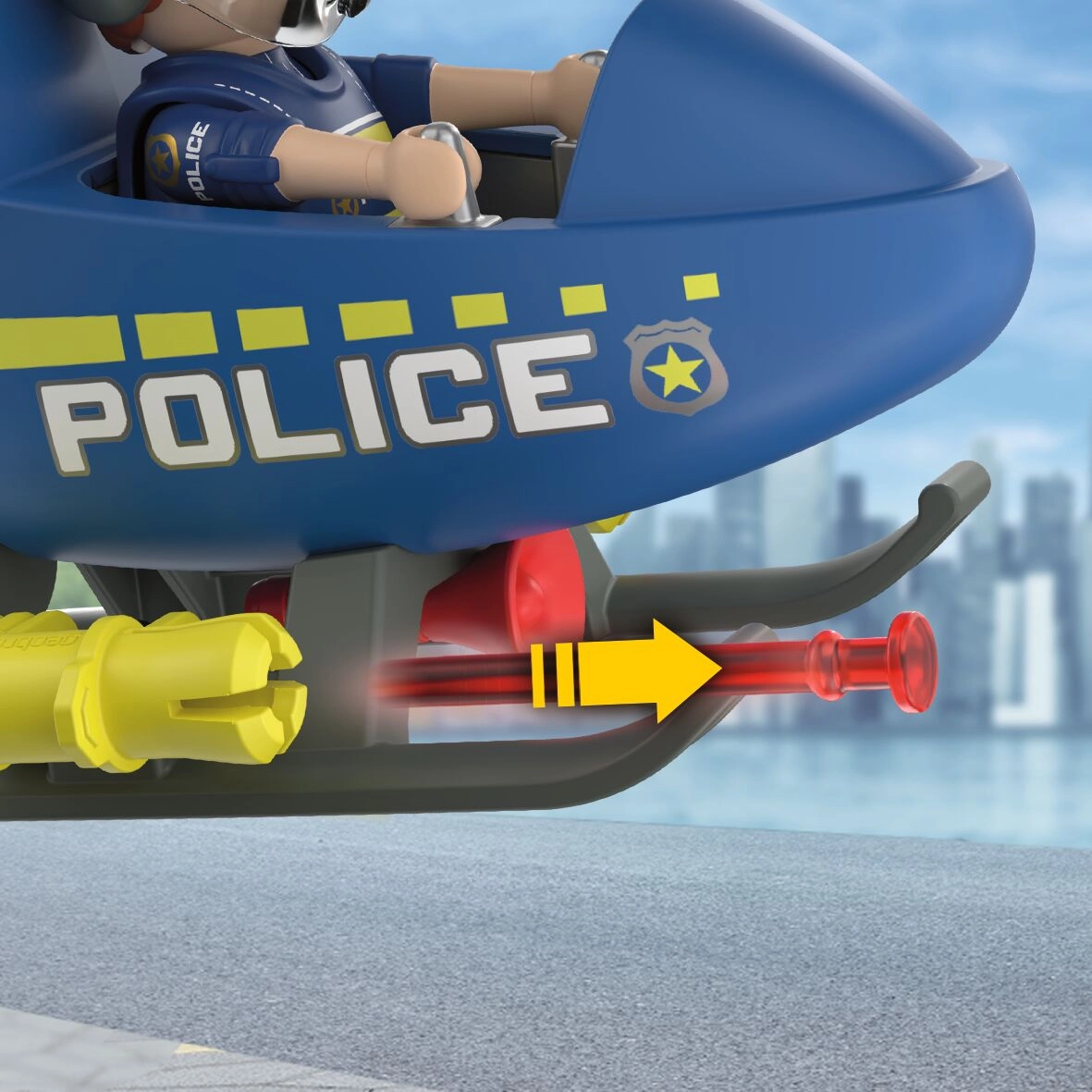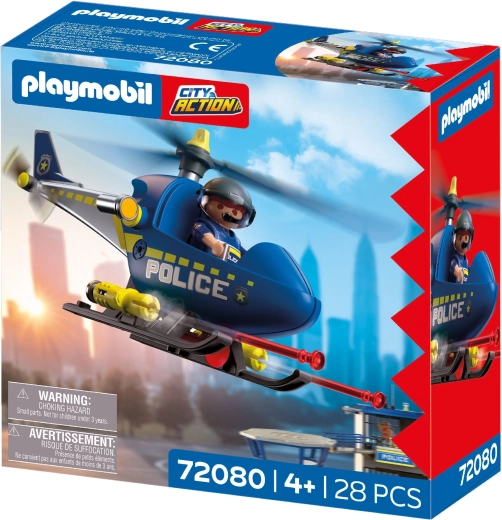 Set PLAYMOBIL City Action donosi dinamičnu akciju u dječju sobu. Helikopter s rotirajućim rotorima omogućuje glatke manevre, dok policajac nadzire područje, oglašava se putem megafona i izvodi sigurnosna upozoravajuća pucanja. Djeca lako stvaraju vlastite priče pune napetosti i pustolovina.