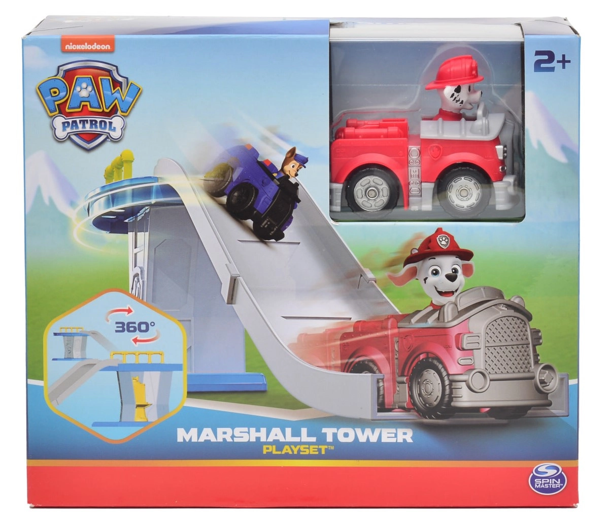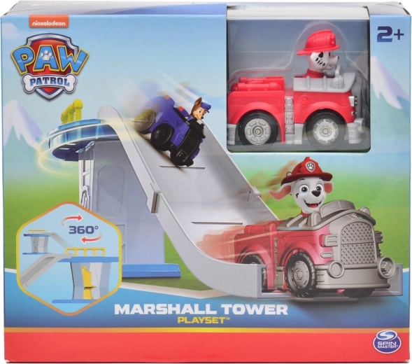 Ovaj šareni set za igru inspiriran popularnom serijom PAW PATROL donosi djeci zabavu svaki dan. Toranj s pokretnom rampom omogućuje vozilu glatko spuštanje i polazak u spasilačku akciju. Uključuje mini vatrogasno vozilo Marshall s čvrsto integriranom figurom psića za brz početak igre.