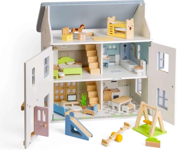 Realistični dodaci podupiru prirodan razvoj socijalnih vještina i komunikacije, dok premještanje i aranžiranje namještaja vježba finu motoriku. Set je dizajniran u nježnim pastelnim bojama i glatkim oblicima, koji se odlično uklapaju s većinom standardnih kućica za lutke.