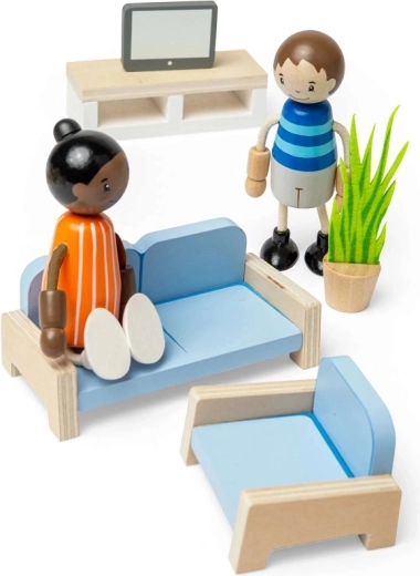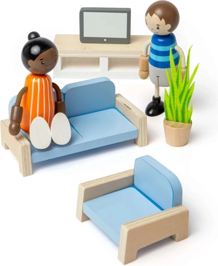 Ovaj pažljivo izrađen set pretvara svaku kućicu za lutke u pravi dom. Djeca mogu posjesti lutke na udobnu sofu, planirati posjete ili izmišljati vlastite TV emisije i obiteljske priče. Zahvaljujući kvalitetnom drvu s FSC® certifikatom, namještaj je čvrst, siguran i spreman za dugačke sate maštovite igre.