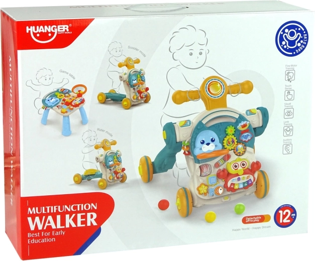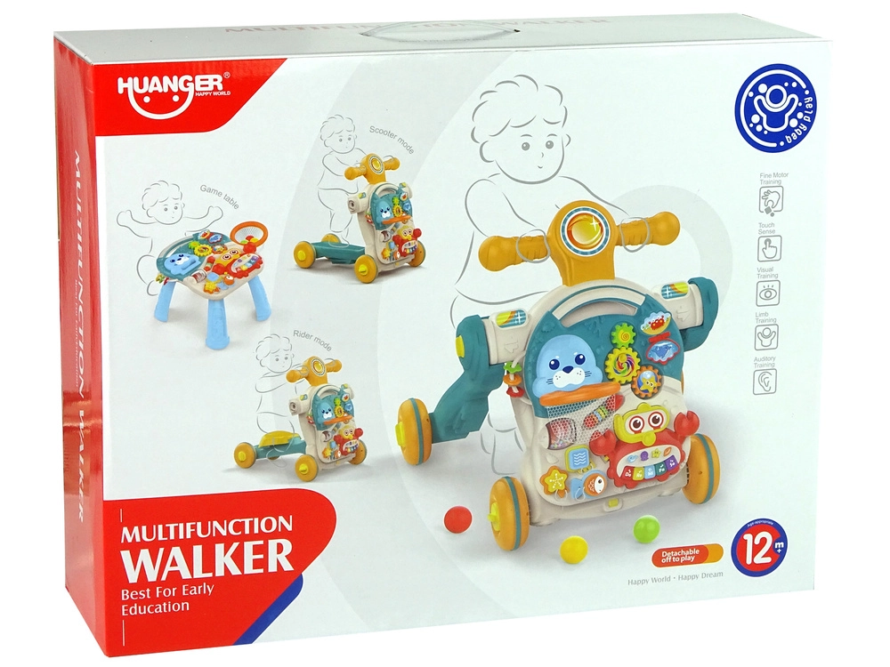Ovaj multifunkcionalni pomagač raste s vašim djetetom. U načinu hodalice pomaže pri prvim koracima, kao edukativni stolić i odvojiva ploča zabavlja i na tepihu ili u krevetiću. Pretvorbom u guralicu ili romobil potiče ravnotežu, koordinaciju i sigurnost u kretanju.