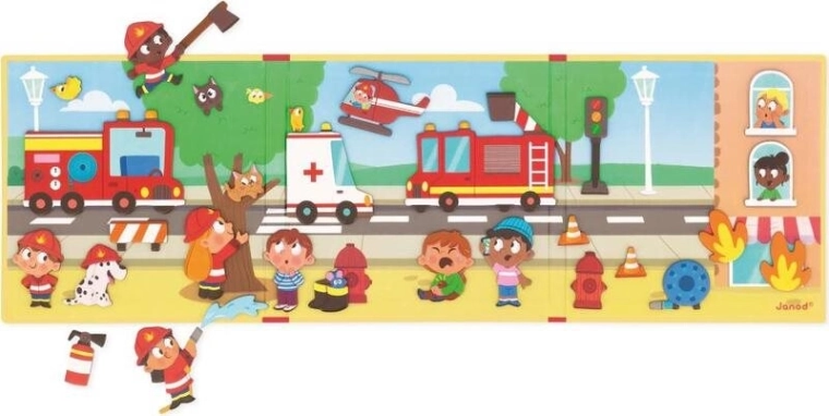Magnetna knjiga vatrogasci JANOD donosi djeci puno zabave i učenja u jednom. Velika magnetna pozadina i 30 tematskih magnetića s motivima vatrogasaca i ukrasa omogućuju djeci slaganje beskrajnih priča, razvoj mašte i fine motorike.
