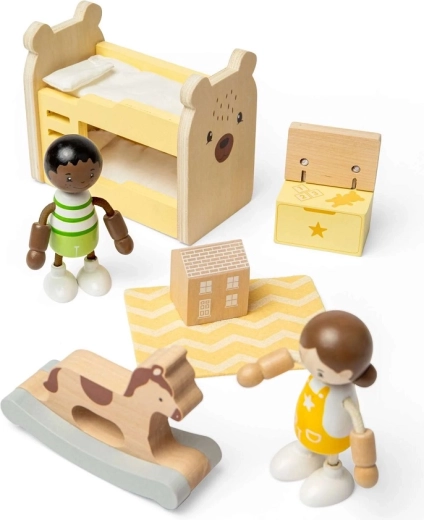Ovaj pomno izrađen set namještaja pretvara svaku kućicu za lutke u ugodnu dječju sobu punu mašte. Djeca mogu stavljati lutke u krevet na kat, ljuljati ih na njihajućem konjiću, spremati blaga u škrinju za igračke i aranžirati sobicu uz pomoć dodataka, uključujući uzorak tepiha i mini kućicu.