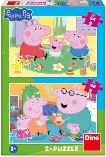 Otkrijte radost slaganja s dječjim puzzlama s motivima Peppa Piga. Pakiranje sadrži 2 slike od 24 i 48 dijelova s dimenzijom motiva 26,4 × 18,1 cm, idealno za djecu od 3 godine.