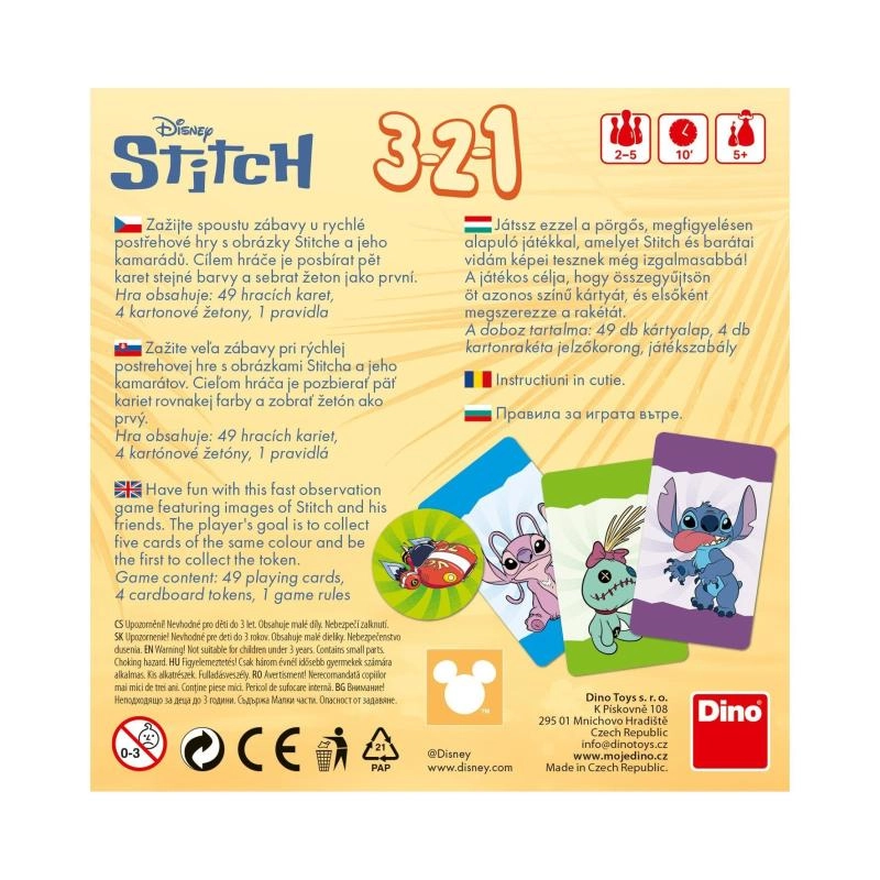Tražite brzu i lako razumljivu igru za put? 3-2-1 STITCH putna kartaška igra donosi šarenu zabavu s omiljenim junacima STITCH i Angel. Cilj je što brže složiti pet karata iste boje i prestići protivnike.