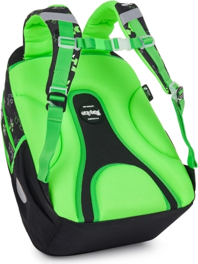 Sigurnost osigurava velika količina reflektirajućih elemenata, dok učvršćeno vodonepropusno dno štiti sadržaj i pri lošijem vremenu. Dio seta je pernica JUMBO za pregledno spremanje pribora za pisanje i lagana sportska/trenažna vrećica sa zatezanjem. Dizajn s pixel/geometrijskim uzorkom u zeleno‑crnoj kombinaciji je stilski i bezvremenski.