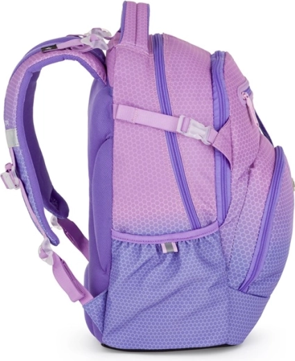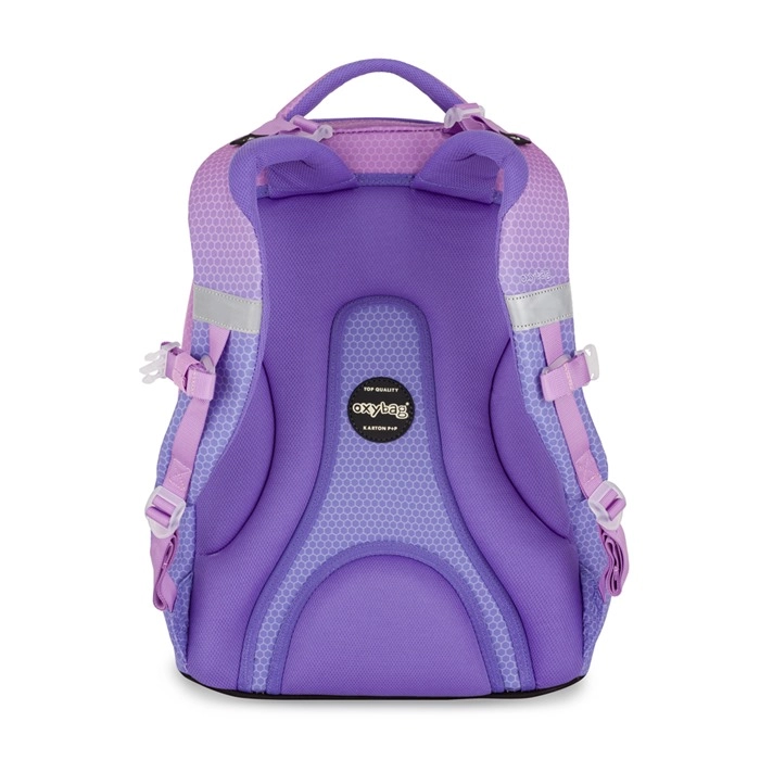 Stilska školska torba OXY Ombre u ružičasto‑ljubičastoj izvedbi idealna je za školarce od 3. razreda. Nudi anatomski oblikovan leđni panel, podstavljene naramenice i podesivi prsni remen za udobno nošenje. Zahvaljujući čvrstom dnu stabilno stoji, ima dva prostrana odjeljka, bočne džepove za bocu, prednji džep za užinu i reflektirajuće elemente za veću sigurnost.