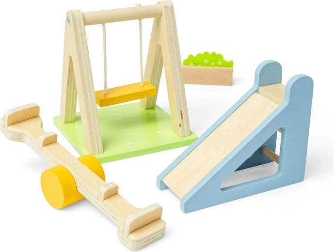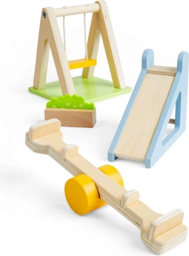 Pretvorite vrt svoje kućice za lutke u mjesto puno pokreta i mašte. Set sadrži najomiljenije elemente igrališta – ljuljačku, tobogan, klackalicu i dekorativnu cvjetnu gredicu. Zahvaljujući glatkim drvenim dijelovima u nježnim pastelnim bojama, rukovanje je ugodno i sigurno.