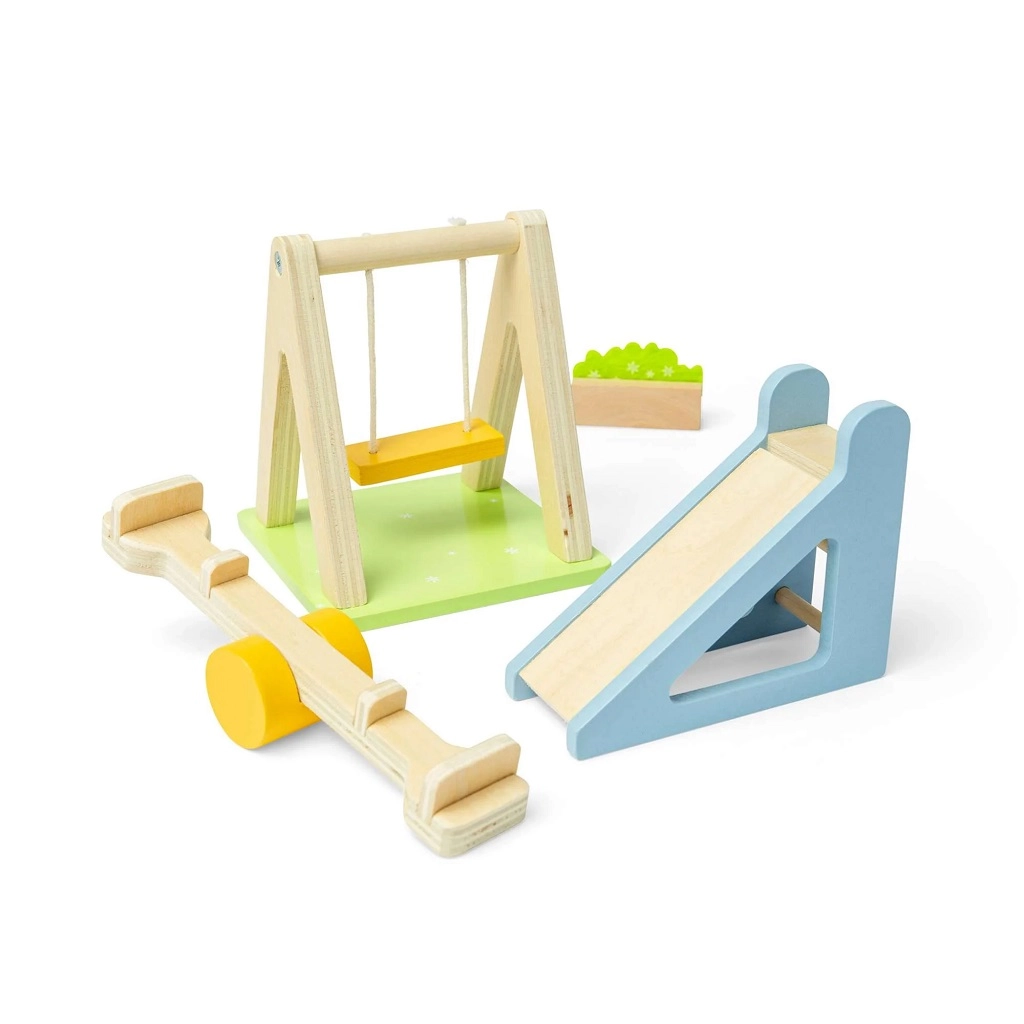 Dodajte kućici za lutke atmosferu pravog igrališta s ovom prekrasnom setom Bigjigs Toys. Sadrži ljuljačku, tobogan, klackalicu i cvjetnu gredicu za kreativnu igru. Izrađeno od FSC® certificiranog drva, sigurno, izdržljivo i obzirno prema prirodi. Odlično potiče finu motoriku, koordinaciju i igranje uloga za djecu od 3 godine naviše.