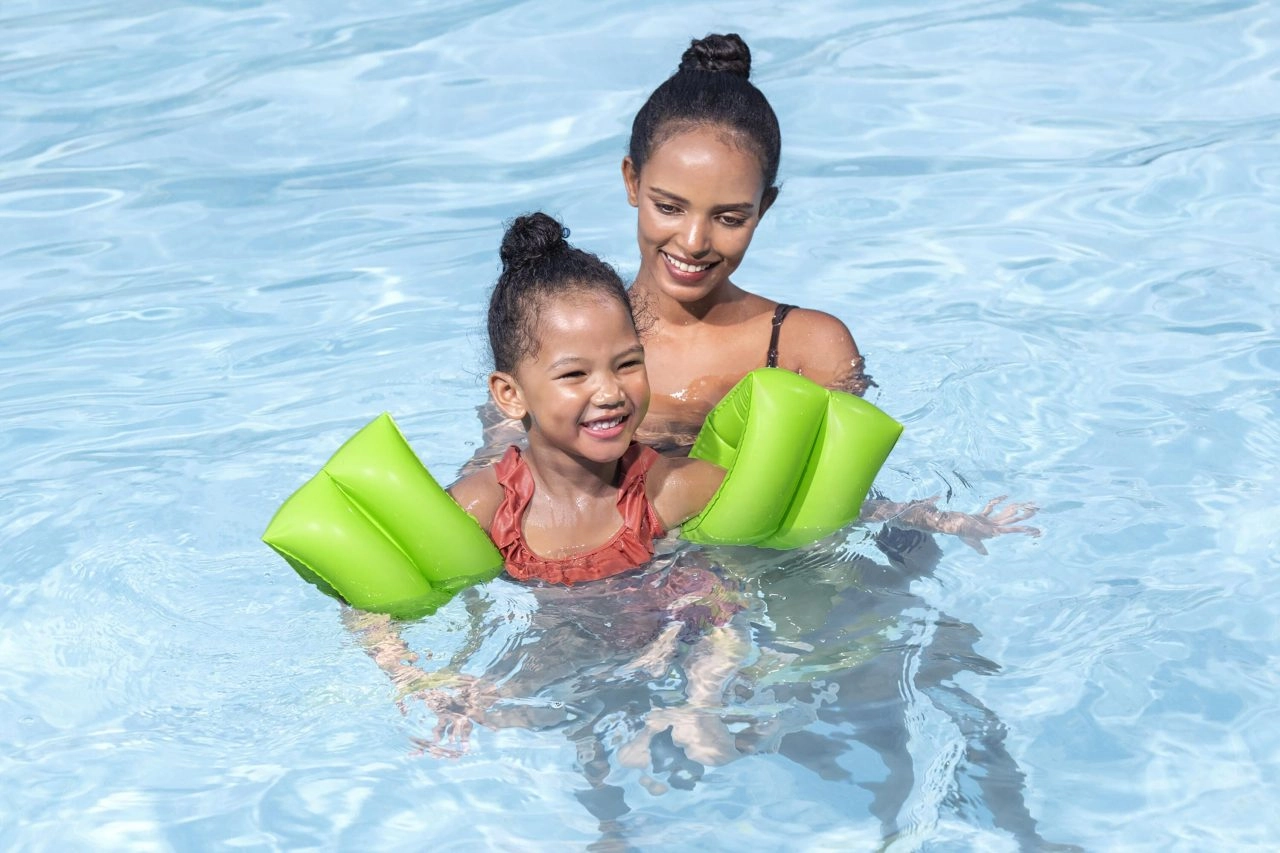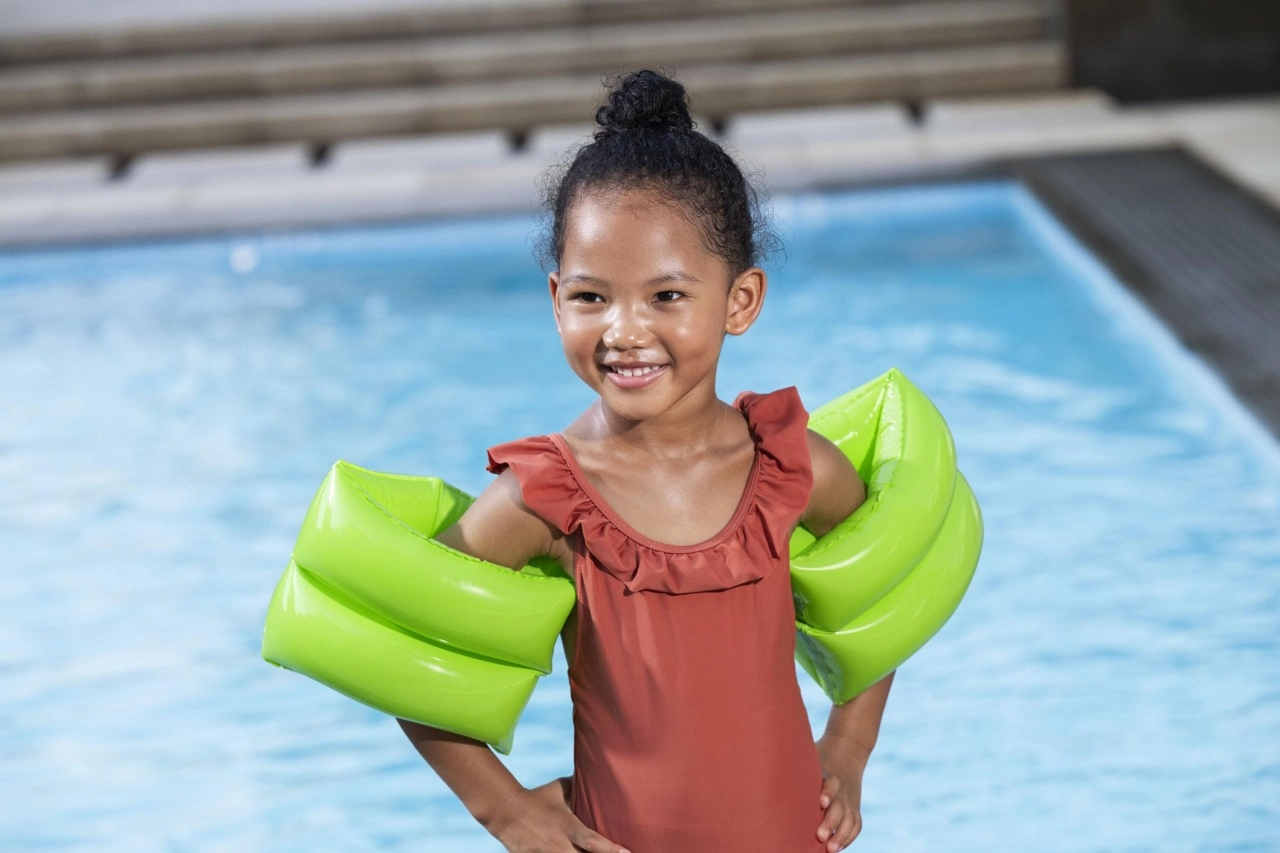 Sigurne i udobne nafukljive rukavice za djecu BESTWAY pomažu graditi sigurnost u vodi. Zahvaljujući dvjema zračnim komorama, izdržljivim ventilima i upadljivoj zelenoj boji pružaju odličnu plovnost, vidljivost i lakoću stavljanja – idealne za učenje plivanja u bazenu i u moru.