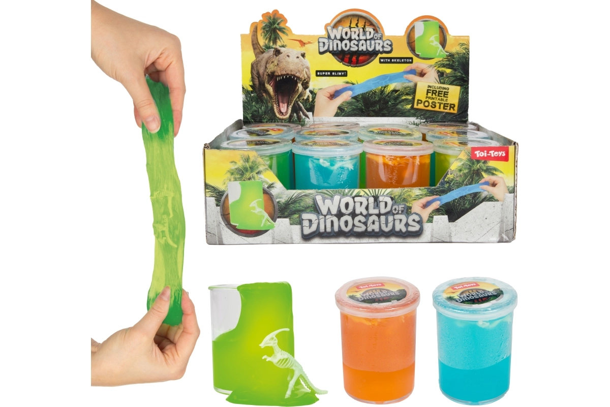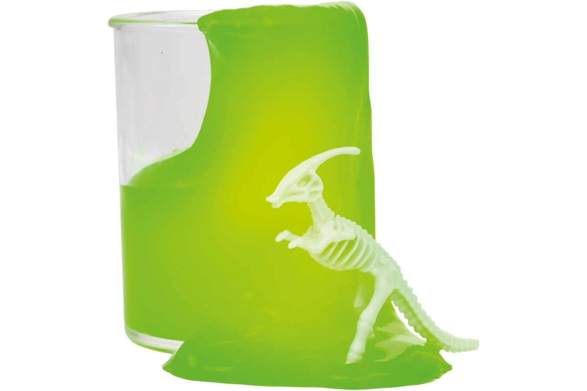 U središtu slimea čeka malo iznenađenje – dinosaurova kost koja potiče znatiželju i produžuje vrijeme igre.