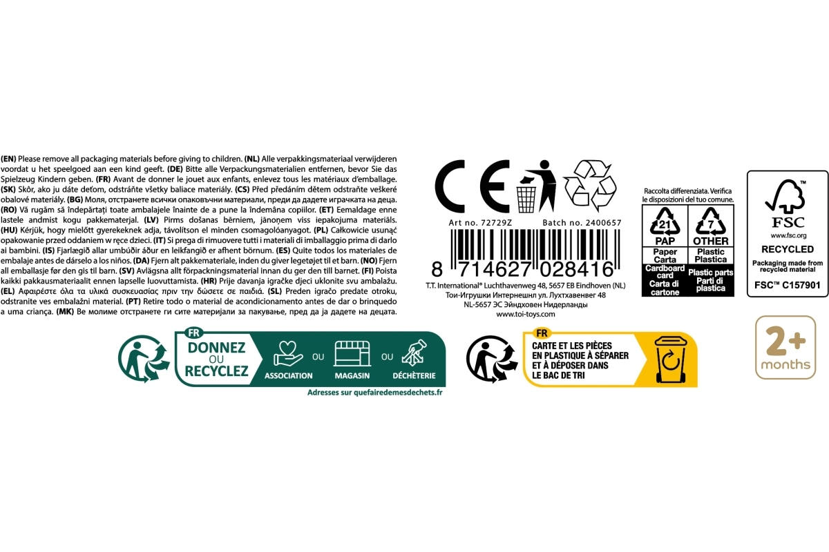 Tješilica je pakirana na kartonu, pa je pogodna i kao lijep poklon za nove roditelje. Jednostavno održavanje i univerzalan dizajn čine je praktičnim dodatkom za krevetić, kolica i autosjedalicu.