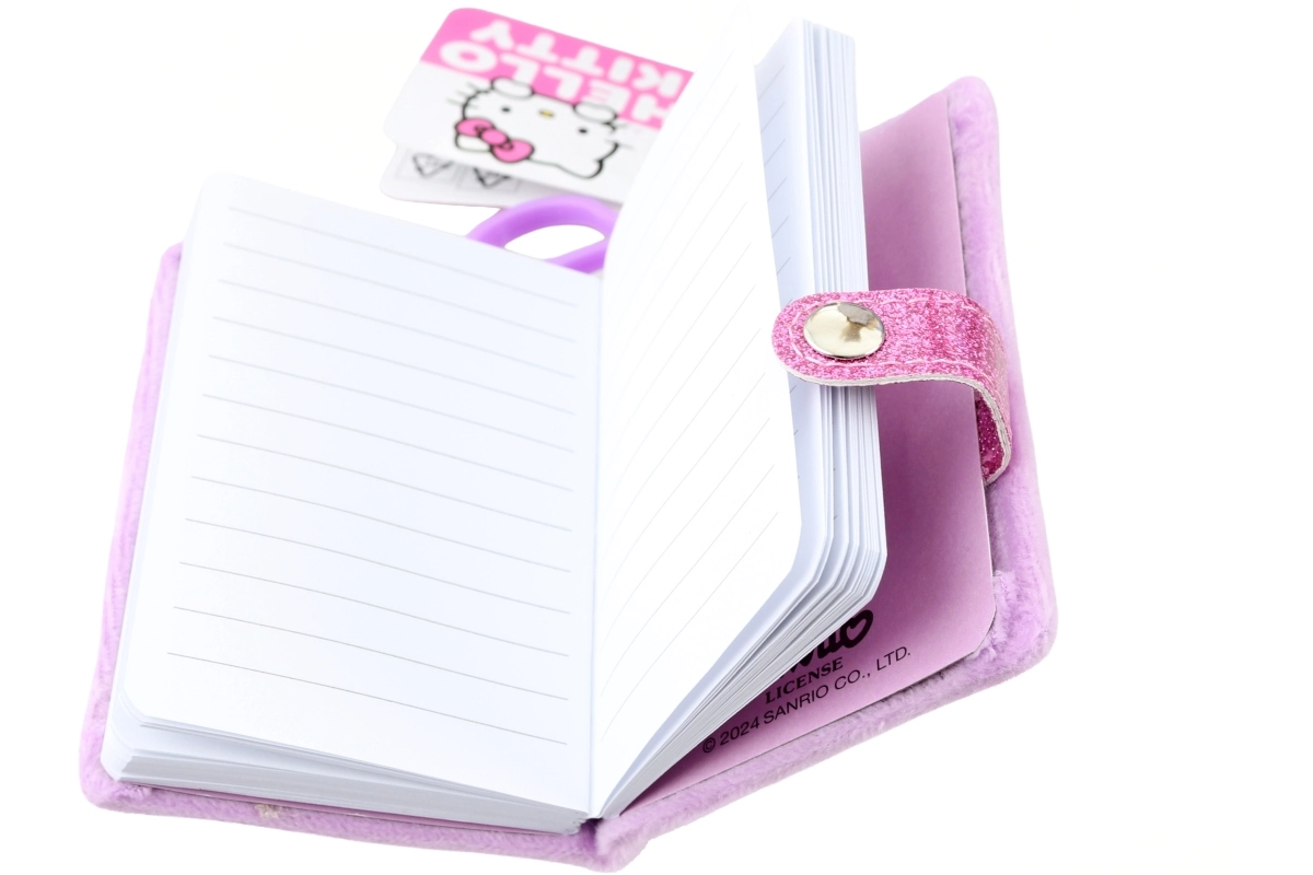 Stilizan i praktičan dodatak za svakodnevne bilješke, popise i tajne misli. Ovaj plišani mini notes s ikoničnim motivom HELLO KITTY voljet će i djeca i odrasli. Mekana površina ugodna je na dodir, a slatki vez daje notesu jedinstven izgled.