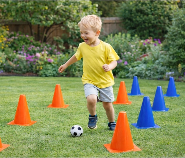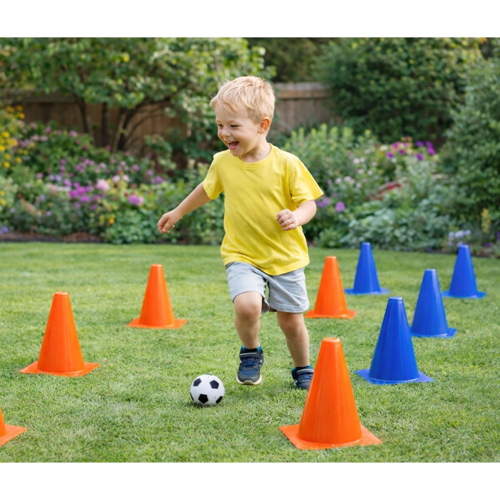 Čunjevi u intenzivnoj narančastoj i plavoj boji pomažu djeci bolje pratiti stazu i povećavaju sigurnost treninga na igralištu i u dvorištu.