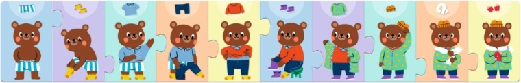 Otkrijte čaroliju prvih pripovjednih slagalica. Djeca će naučiti prepoznati ispravan redoslijed radnji – od oblačenja do gotove odjevne kombinacije – a pritom će vježbati strpljenje, koncentraciju i koordinaciju oko–ruka. Dijelovi su izrađeni od izdržljivog kartona koji podnosi često slaganje malim ručicama.