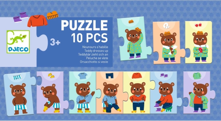 Zabavna dječja slagalica u kojoj djeca slažu kako se medvjedić postupno oblači. Idealno za razvoj fine motorike, logike i redoslijeda koraka. Sadrži 10 čvrstih dijelova, kvalitetan karton i ilustracije koje djecu zabavljaju.