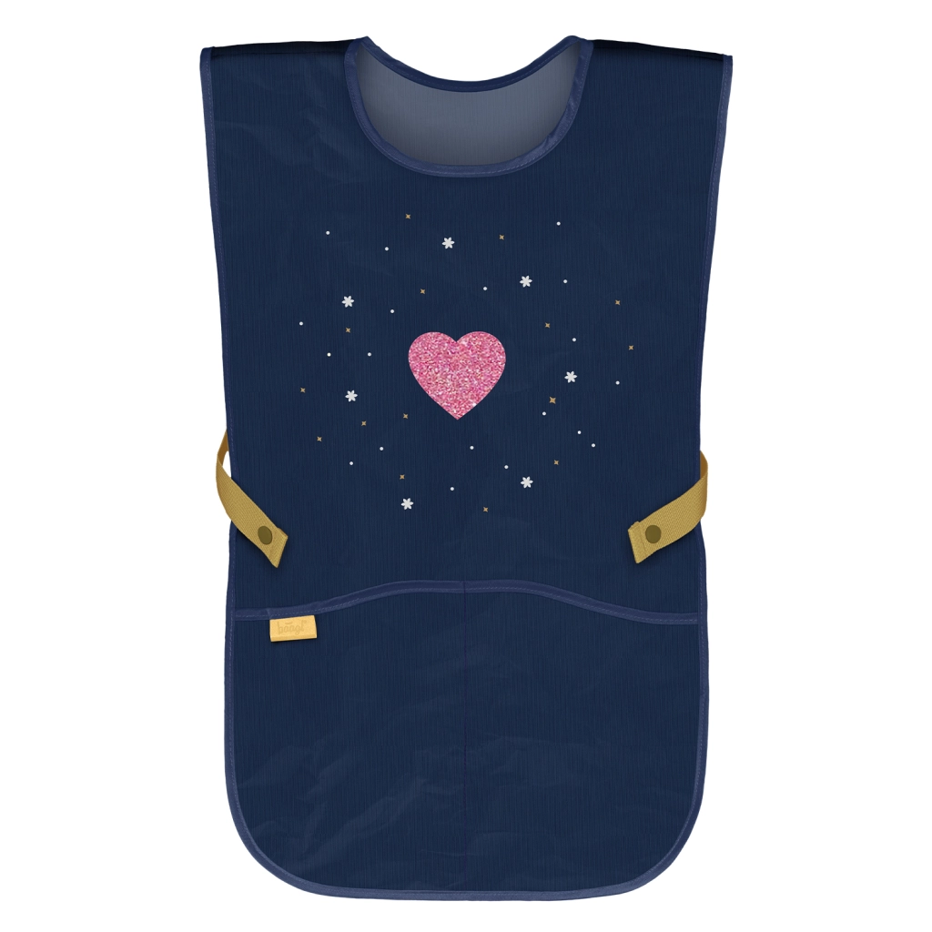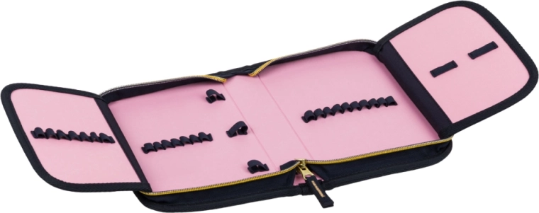 Jednoslojna pernica s dvije preklopne stranice opremljena je kvalitetnim YKK patentnim zatvaračem, ima džepiće za sitnice, prozorčić za raspored i čvrste gumice prikladne i za trokutaste bojice. Vrećica s izdržljivim vezicama i karabinerom lako se pričvrsti na aktovku, dječja pregača od perivog materijala štiti odjeću tijekom kreativnih aktivnosti, a novčanik za vrat sigurno drži sitnice pri ruci.