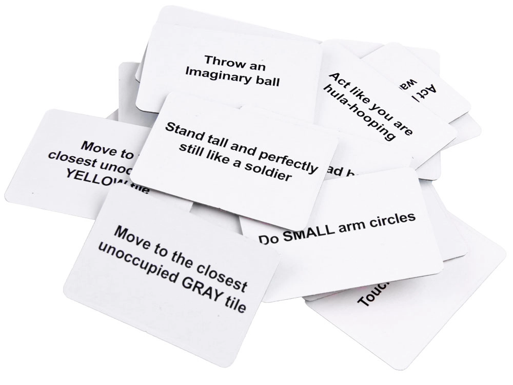 27 preglednih kartica na engleskom s kratkim uputama dodaje akciju: skači, balansiraj, prijeđi na najbližu boju i još mnogo toga.