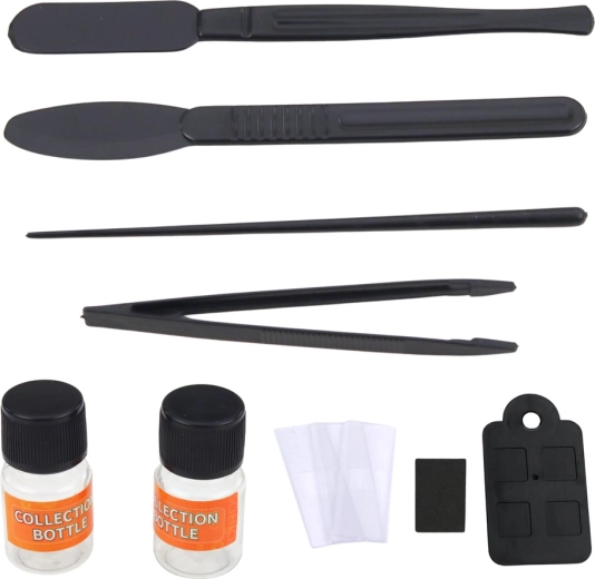- Mikroskop; stakalca i pokrovna stakalca; pipeta; pinceta; špatule i laboratorijski alati; 2 bočice za uzorke; plastična kutijica s lećom i mjerilom; krpica za čišćenje; poklon-kutija