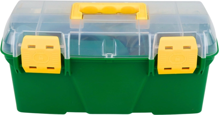 Prozirni poklopac, čvrste kopče i ručka osiguravaju lako prenošenje i pregledno odlaganje svih alata na jednom mjestu.