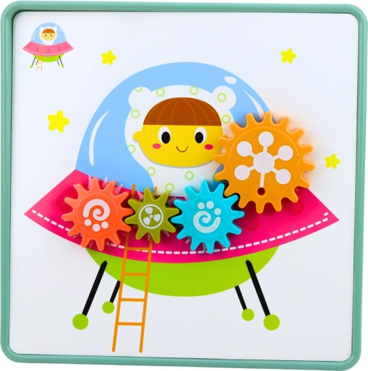 Ova pametna slagalica spaja igru i učenje. Djeca umeću šarena zupčanika u izreze na tematskim kartama i promatraju kako se nakon pravilnog povezivanja sva kola okreću zajedno. Jednostavno i jasno tako usvajaju osnove prijenosa i princip suradnje pojedinih elemenata.