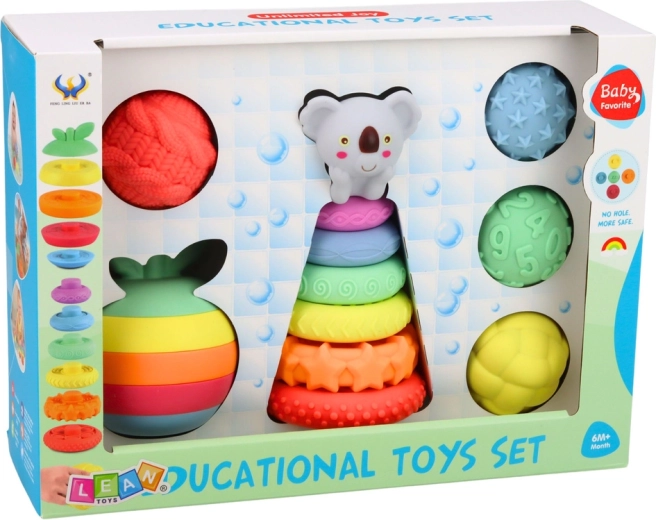 Sastavni dio su šarena piramida s figuricom životinjice na vrhu, nekoliko senzoričkih loptica s izbočinama i sklopiva jabuka od prstenova. Naglašene boje pomažu razvijati vizualnu percepciju i olakšavaju prepoznavanje boja. Idealno za samostalnu zabavu i zajedničke trenutke s roditeljima te kao sjajan poklon za bebe i malu djecu.