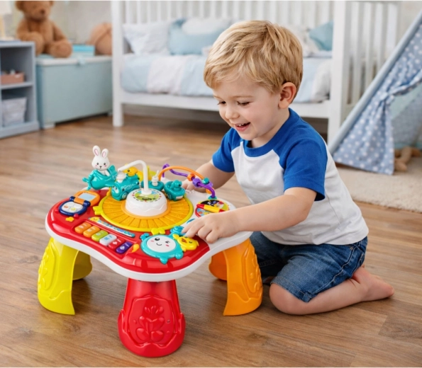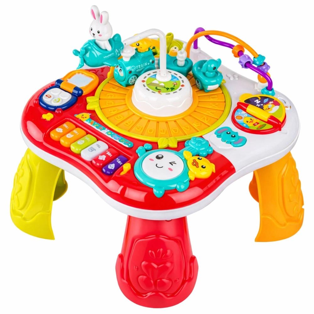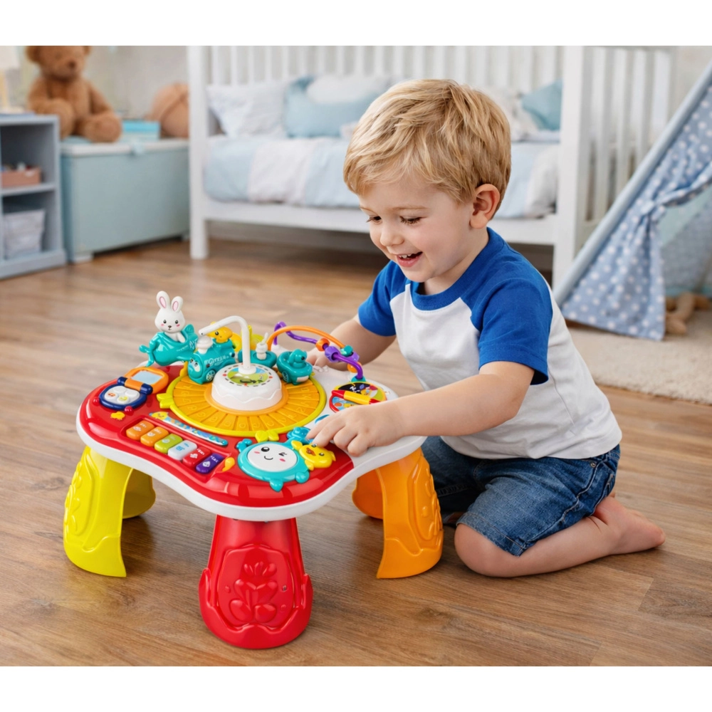 Interaktivni edukativni stolić 2u1 odličan je izbor za razvoj osjetila i vještina djece. Nudi klavir s melodijama, svjetlosne i zvučne efekte, imitaciju telefona, okretne kotačiće i zupčanike te pokretnog zekića koji privlači pažnju. Zahvaljujući odvojivim nogama lako se pretvara u ravan edukativni panel – idealno za različite dobne faze.