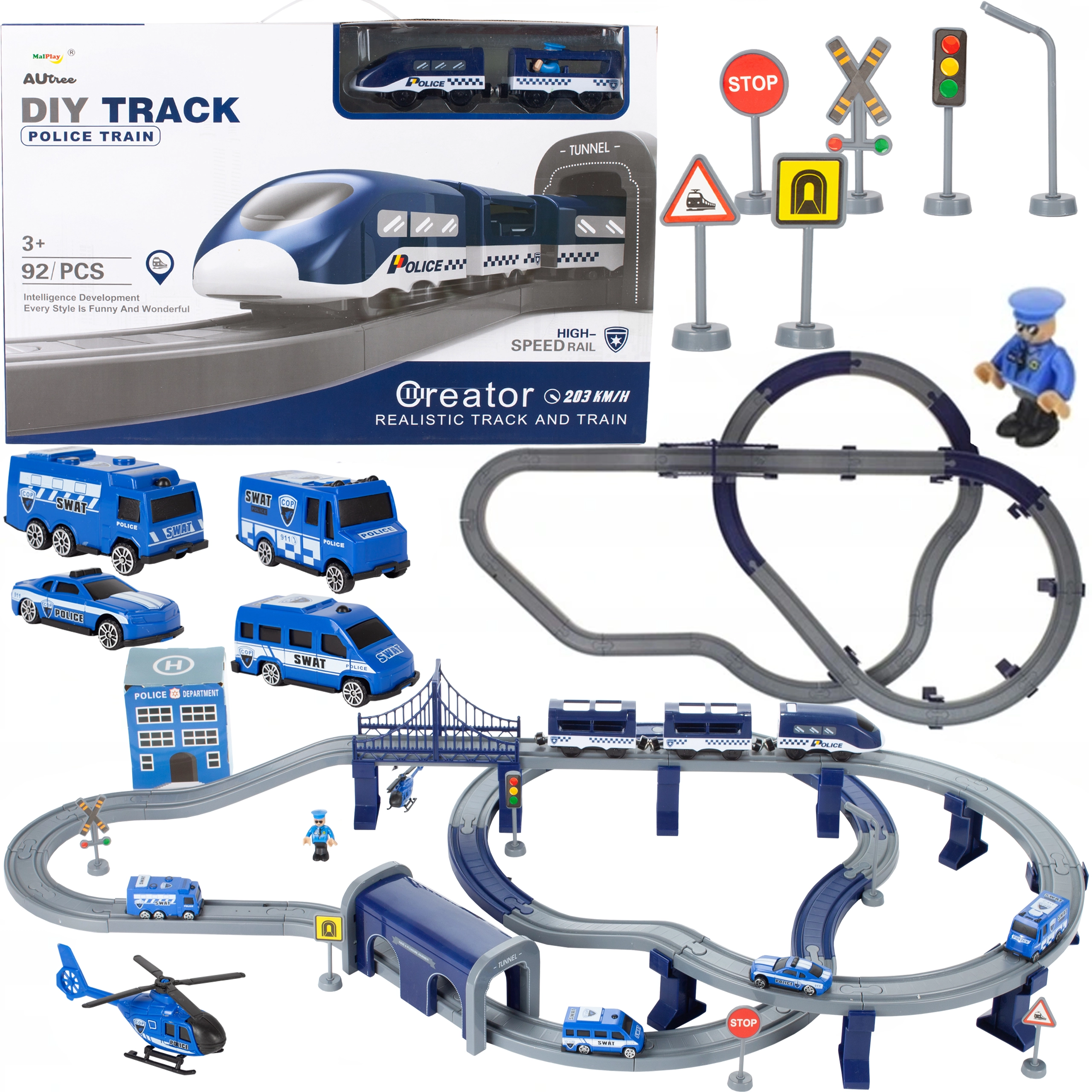Ova policijska željeznička pruga donosi sate zabave u dimenzijama otprilike 103 × 61 × 15 cm. Djeca mogu stvarati vlastite gradske scene – od polaska vlaka preko prijelaza pa sve do intervencija helikoptera. Lokomotiva je na baterije i dopunjena zvukovima koji igri daju realističnu atmosferu.