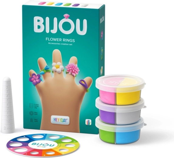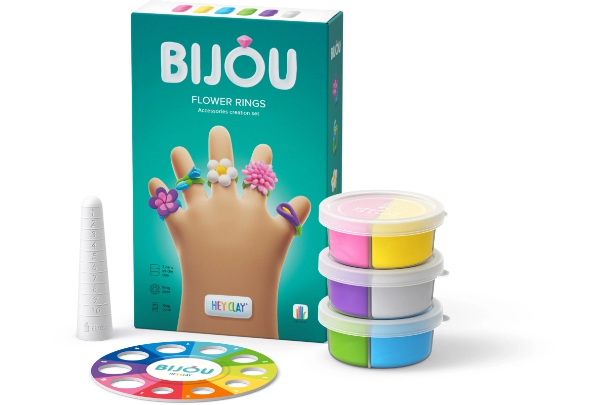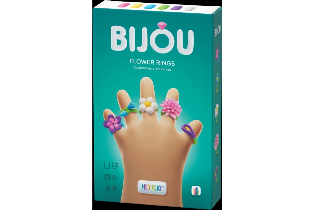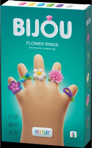 Otkrijte razigran put do vlastitog nakita. Set HEY CLAY Bijou cvjetni prsteni nudi sve što je djeci potrebno za osmišljavanje i izradu nježnih cvjetnih prstena. Zahvaljujući mekanoj i laganoj modelirajućoj masi, s materijalom se lako radi, a gotovi ukrasi nakon stvrdnjavanja zadržavaju oblik.