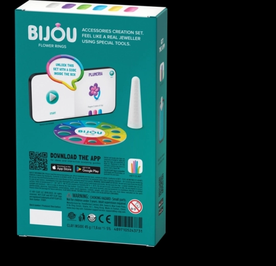 - 3 posudice meke i lagane modelirajuće mase, 2 baze za prsten, poseban alat za oblikovanje, pristupni kod za aplikaciju HEY CLAY
