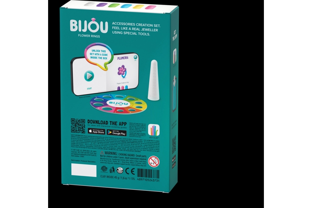 Izradite vlastiti originalni nakit uz kreativni set HEY CLAY Bijou cvjetni prsteni. Meka i lagana masa za modeliranje lako zadržava oblik, a nakon 24 sata na zraku stvrdne u izdržljiv nakit. Pakiranje sadrži 3 posudice mase, 2 baze za prsten, poseban alat za oblikovanje te pristup mobilnoj aplikaciji HEY CLAY s interaktivnim video uputama korak po korak. Idealno stvaranje za djecu od 3 godine.