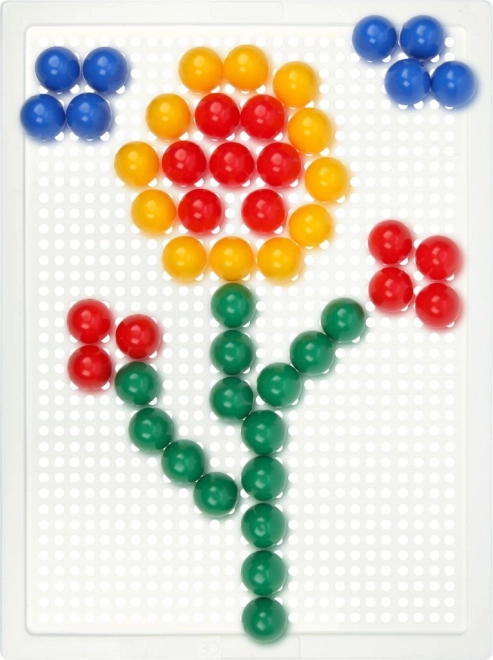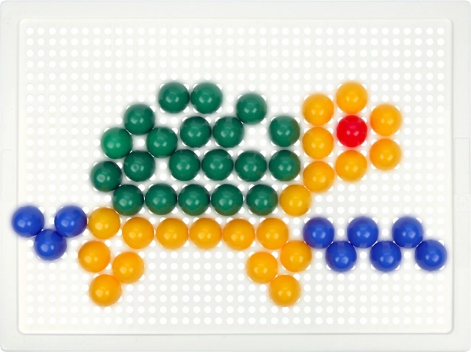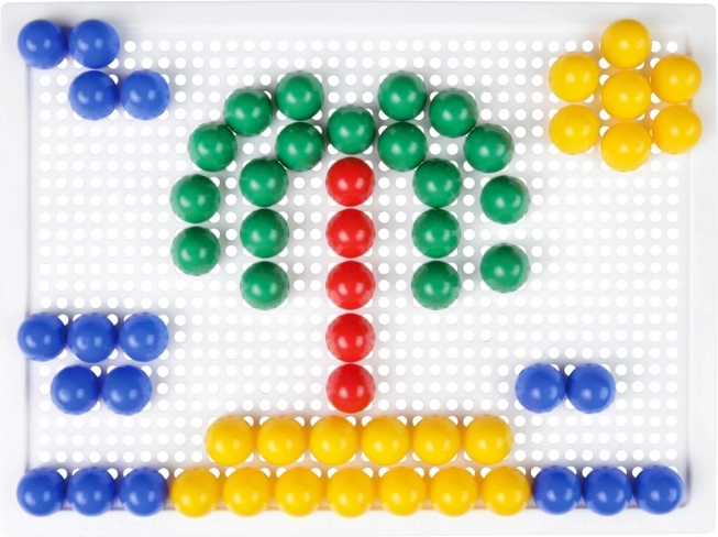 Set sadrži plastičnu mrežicu 21 × 16 cm i 80 čepića promjera 15 mm. Zahvaljujući kompaktnim dimenzijama, idealan je za dom i putovanja. Mozaik ne sadrži predloške – tako potiče slobodnu igru i maštu.