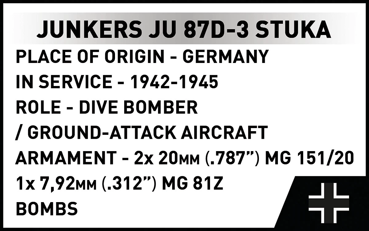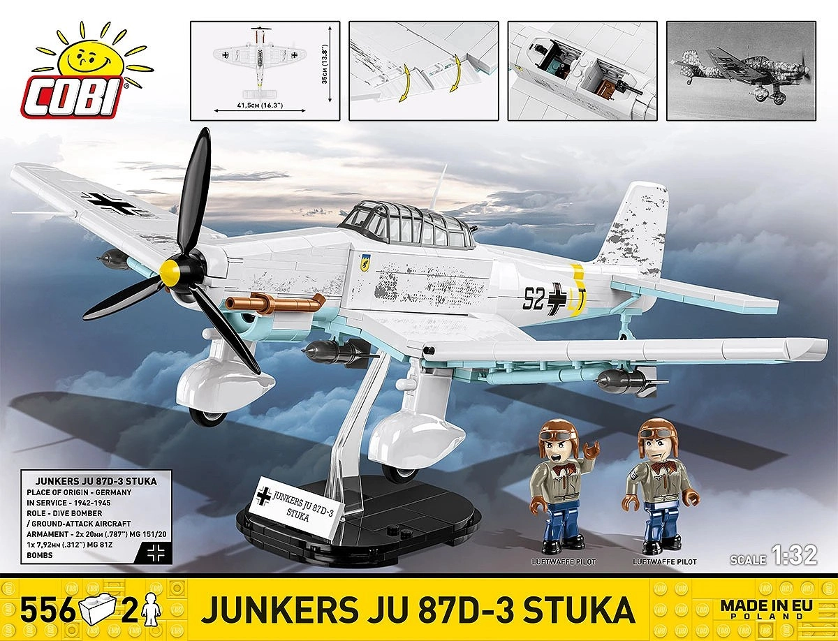 U kompletu su 2 minifigurice posade i crno postolje s nazivom „Junkers Ju 87D-3 Stuka“ za atraktivno izlaganje modela u letu.