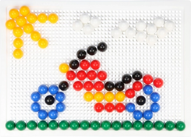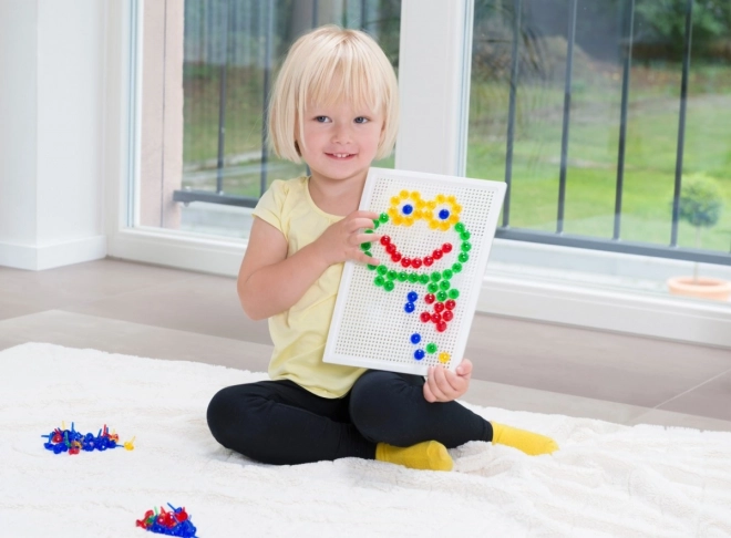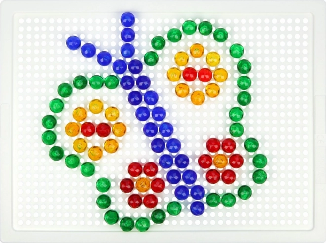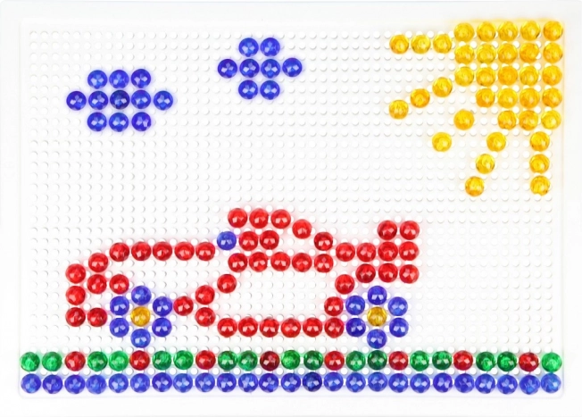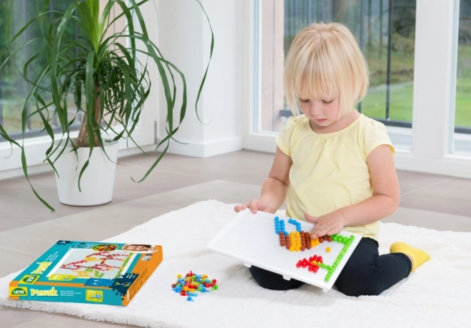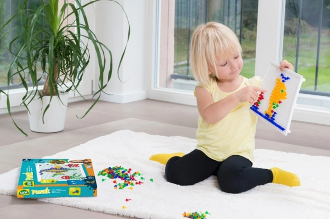 Kristalni mozaik s klobučicama LENA idealan je izbor za učenje kroz igru. Šareni, prozirni čepići lako se umeću u izdržljivu perforiranu ploču i omogućuju djeci slaganje motiva poput ribica, aviona ili cvijeća. Igra prirodno potiče koncentraciju, koordinaciju oko–ruka i prepoznavanje boja.