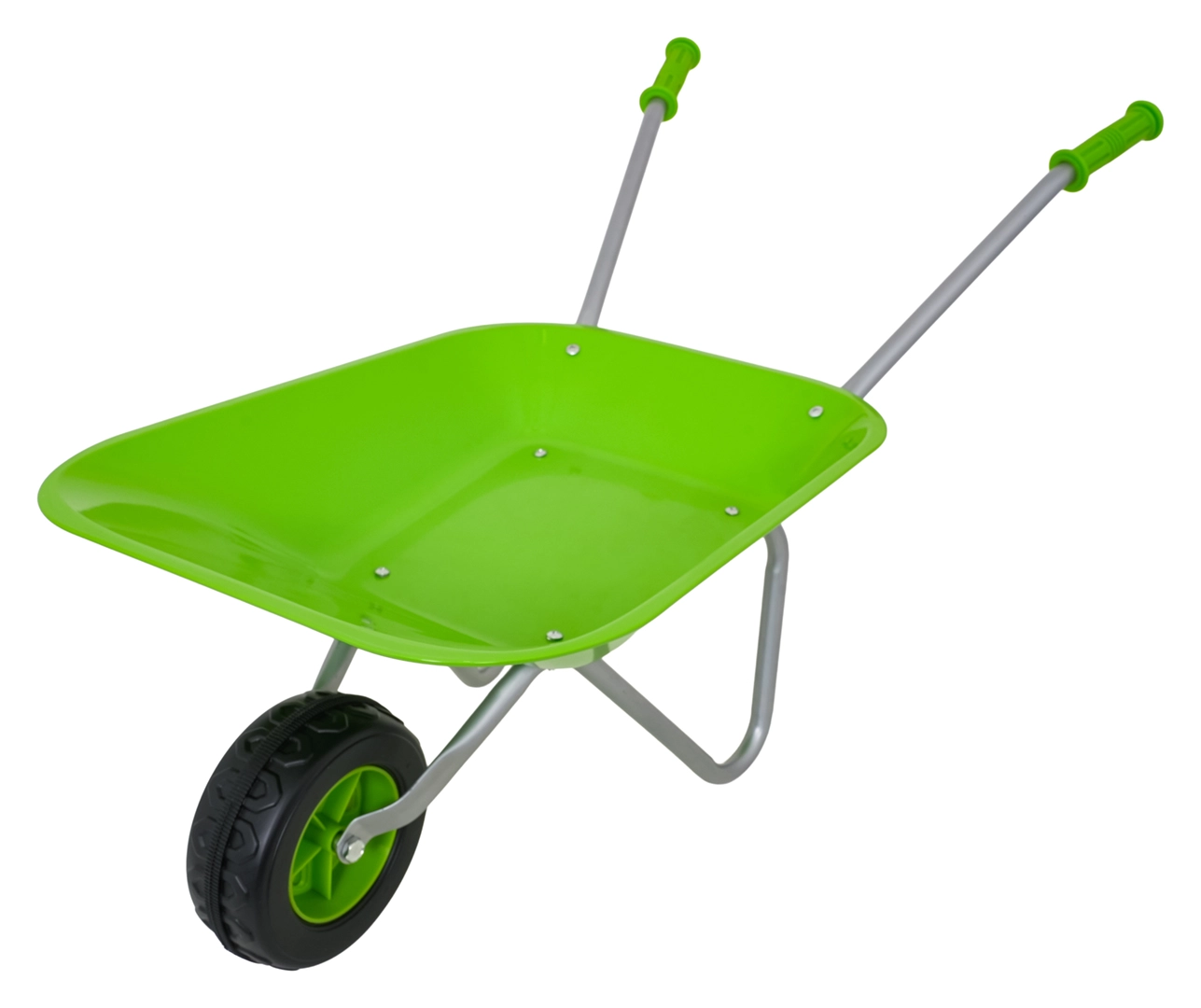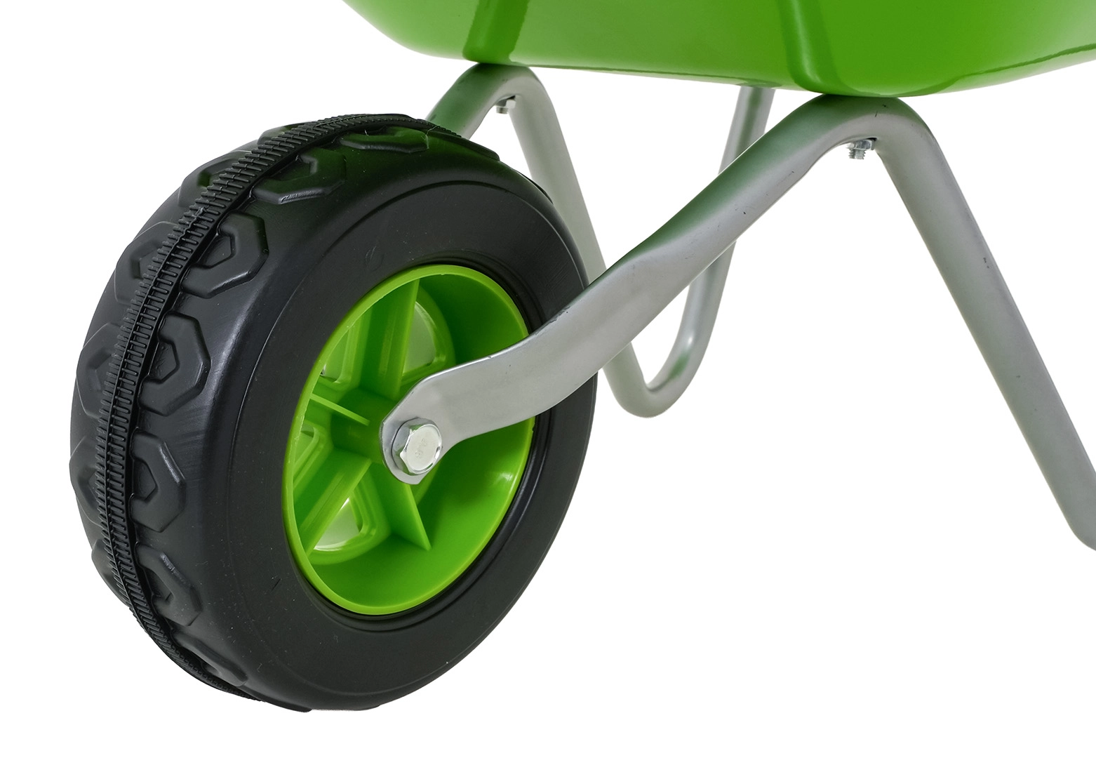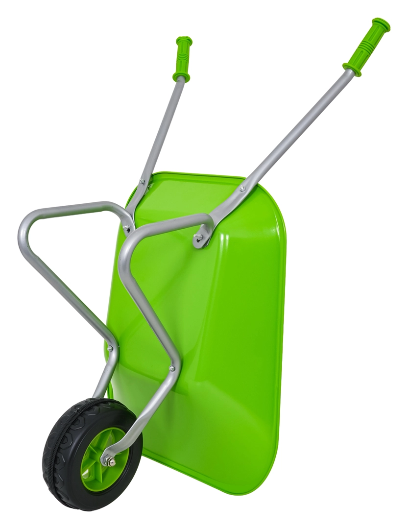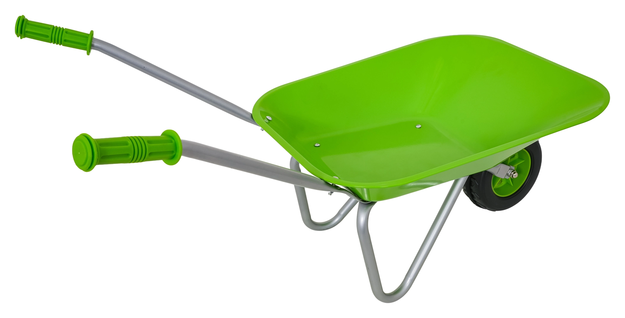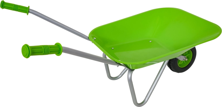 Lagana i stabilna dječja kolica sa širokim koritom i jednim kotačem savladavaju zemlju, lišće i sitni alat. Ergonomske ručke s protukliznim prihvatima olakšavaju rukovanje.
