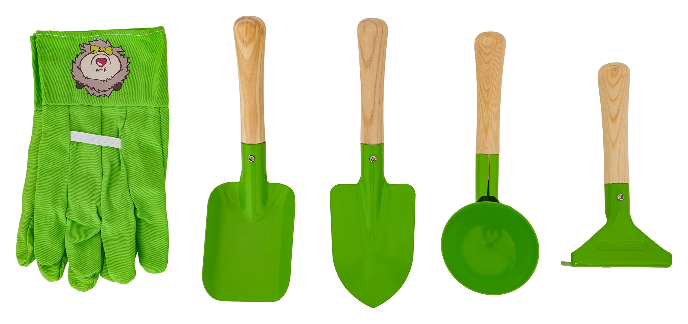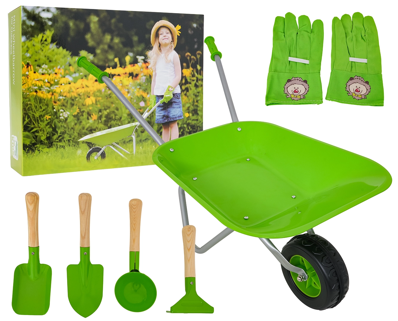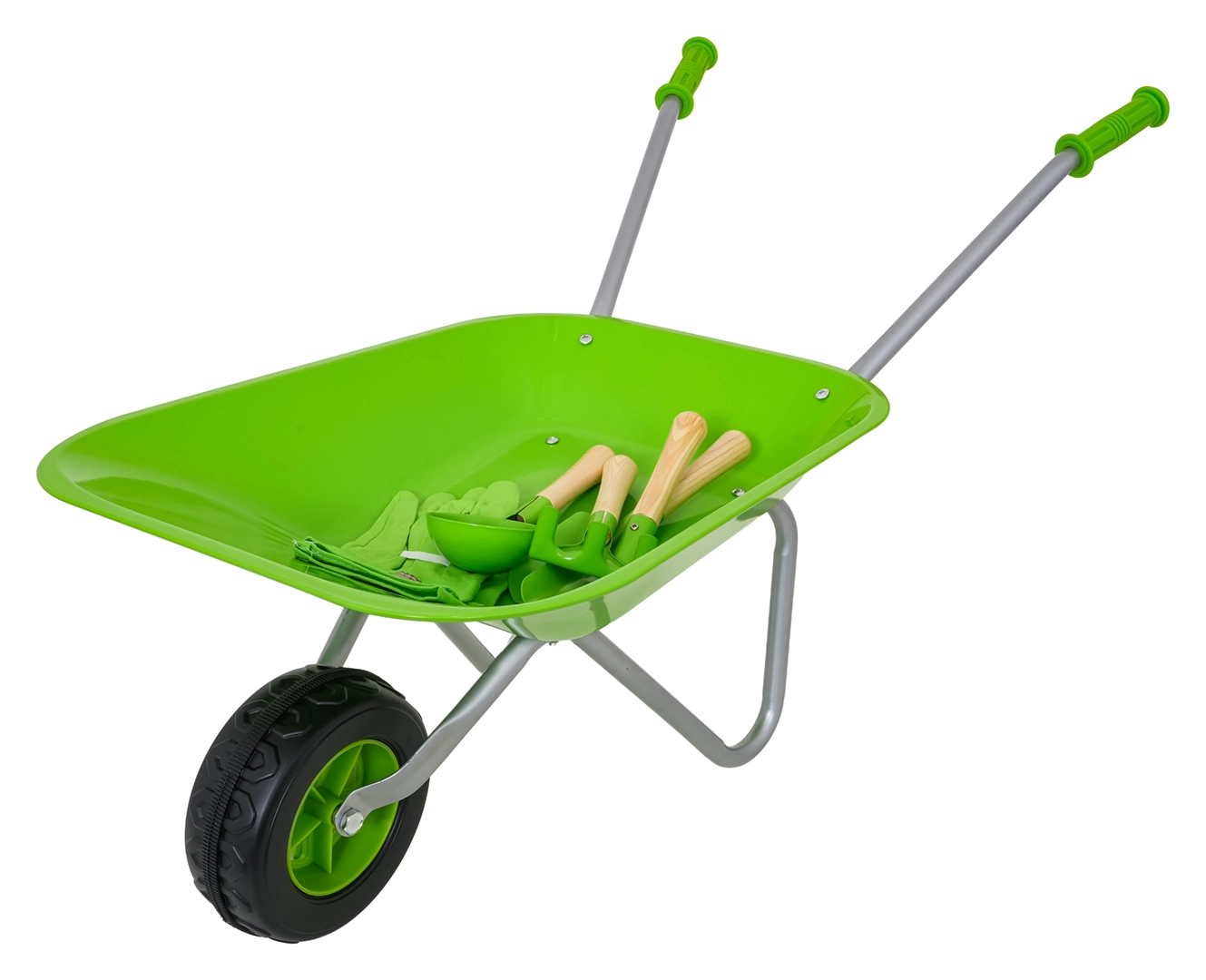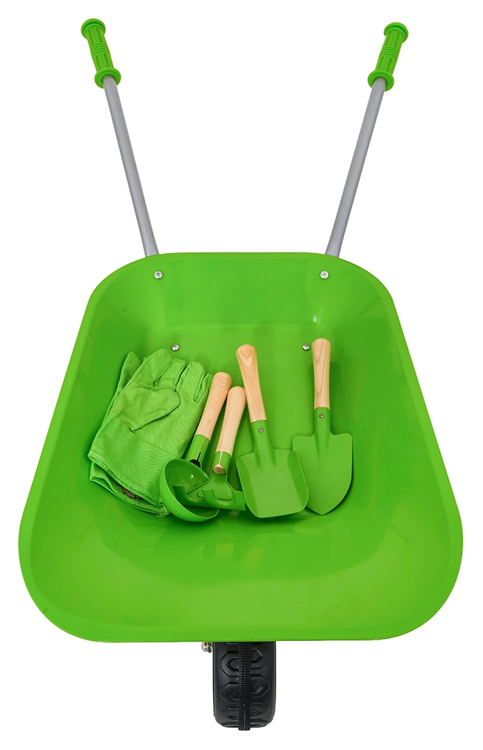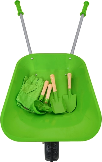 Poticajte znatiželju i spretnost djece setom koji ima sve potrebno za prve korake u vrtlarstvu. Robusna zelena kolica i četiri kvalitetna ručna alata omogućuju malim pomoćnicima kopati, zahvaćati i grabljati zemlju, presađivati biljke i prevoziti materijal. U kompletu su i dječje rukavice za zaštitu ruku.