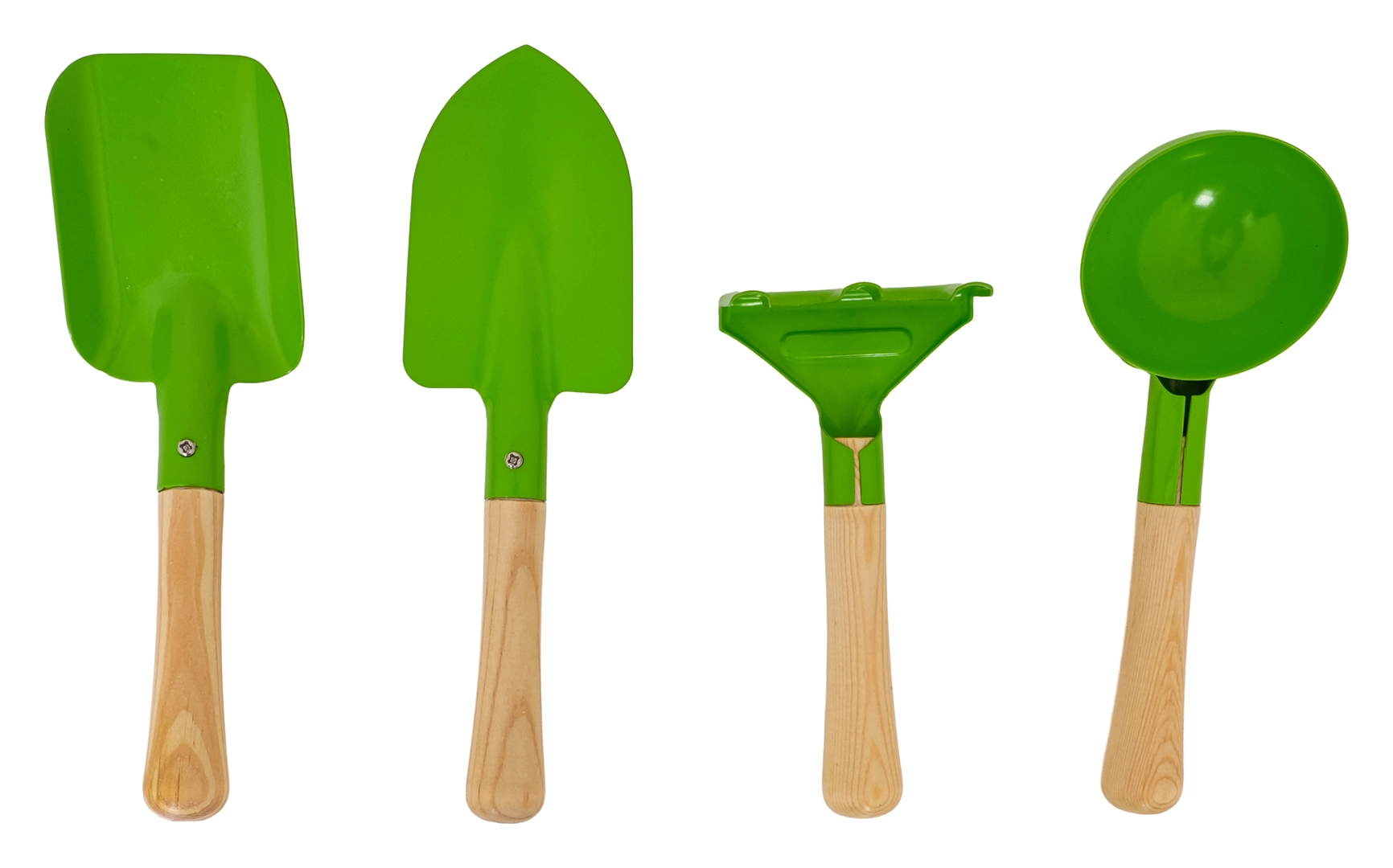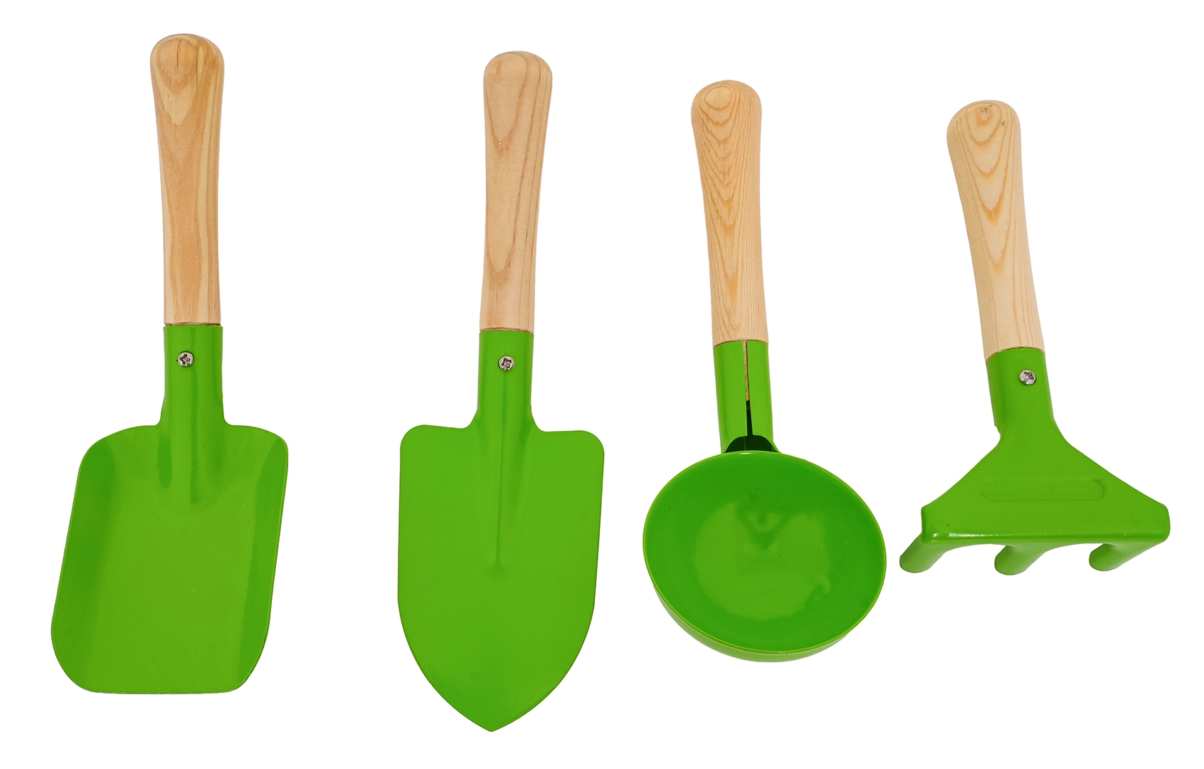 Set sadrži lopaticu, šiljati sadilni rilo, okruglu mjericu i male grablje. Čvrste metalne glave i glatke drvene ručke osiguravaju udobnost i dugotrajnost.