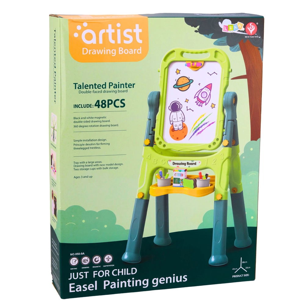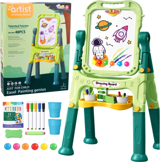 Praktično i zabavno obrazovno pomagalo za djecu – obostrana ploča s bijelom magnetnom suho brisivom stranom i crnom krednom stranom. Zahvaljujući stabilnom stalku s policom, okretanju od 360° i podesivoj visini lako se prilagođava dobi djeteta. Bogat set od 48 dodataka omogućuje odmah započeti stvarati, učiti pisati, crtati i slagati prve riječi.