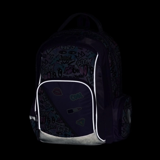 Unutarnju raspodjelu čine dvije prostrane komore za udžbenike i bilježnice, dopunjene praktičnim manjim džepovima za sitnice. Sa strane se nalaze dva džepa – jedan otvoren za bocu i drugi na zatvarač za sigurno odlaganje. Ne nedostaju ni reflektirajući elementi za bolju vidljivost u sumrak te kuke za učvršćivanje dugih naramenica za uredan i siguran izgled.