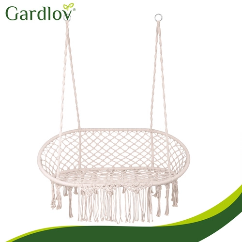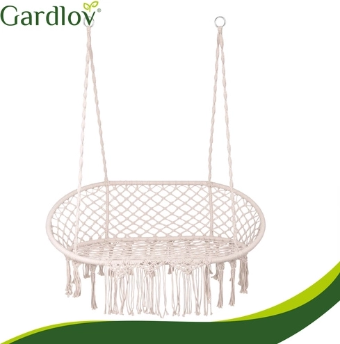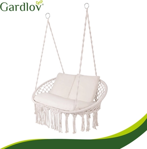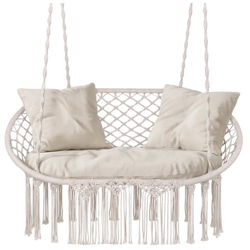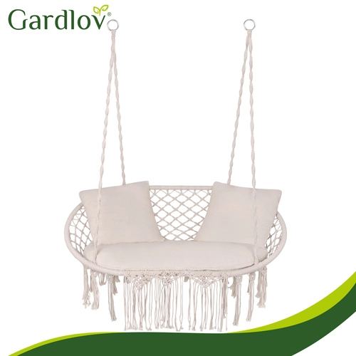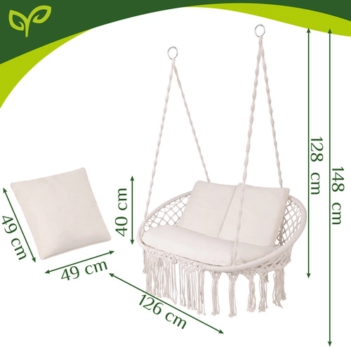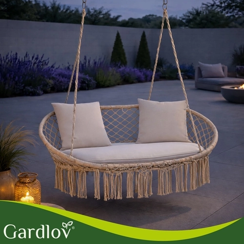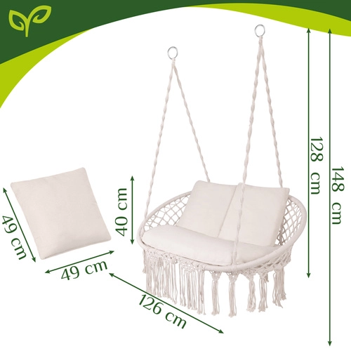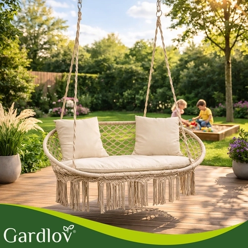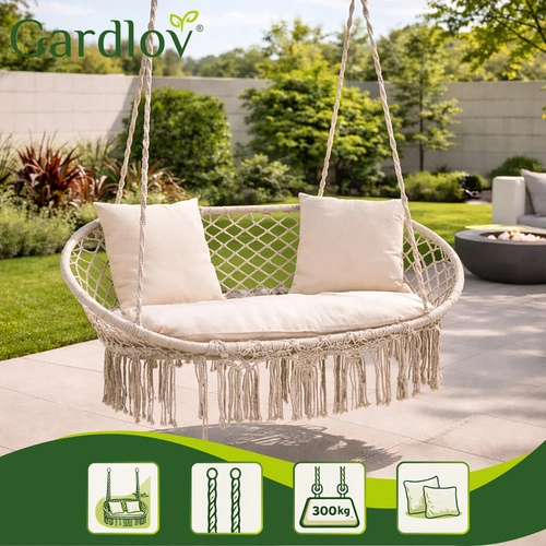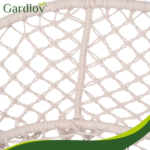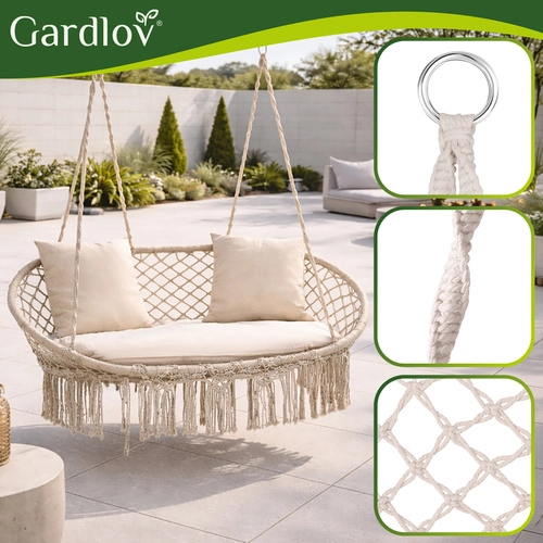 Uživajte u savršenom odmoru u vrtu, na terasi ili balkonu. Dvosjedna ljuljačka tipa gnijezdo za rode GARDLOV nudi prostrano sjedalo, nosivost do 300 kg i 3 mekana jastuka za maksimalnu udobnost. Zahvaljujući čvrstoj metalnoj konstrukciji i izdržljivim užadima s metalnim okama ovjes je stabilan i siguran. Krem izvedba u boho stilu lijepo nadopunjuje svaki eksterijer i interijer.