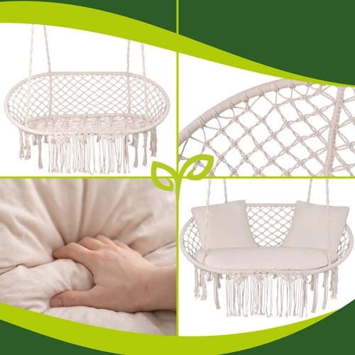 Ljuljačka je spremna za brzu instalaciju i nudi više mogućnosti ovjesa – na gredu, strop ili stalak. Elegantna krem boja i dekorativne rese naglašavaju boho dizajn, koji se lako uklapa i u moderan i u prirodan stil.
